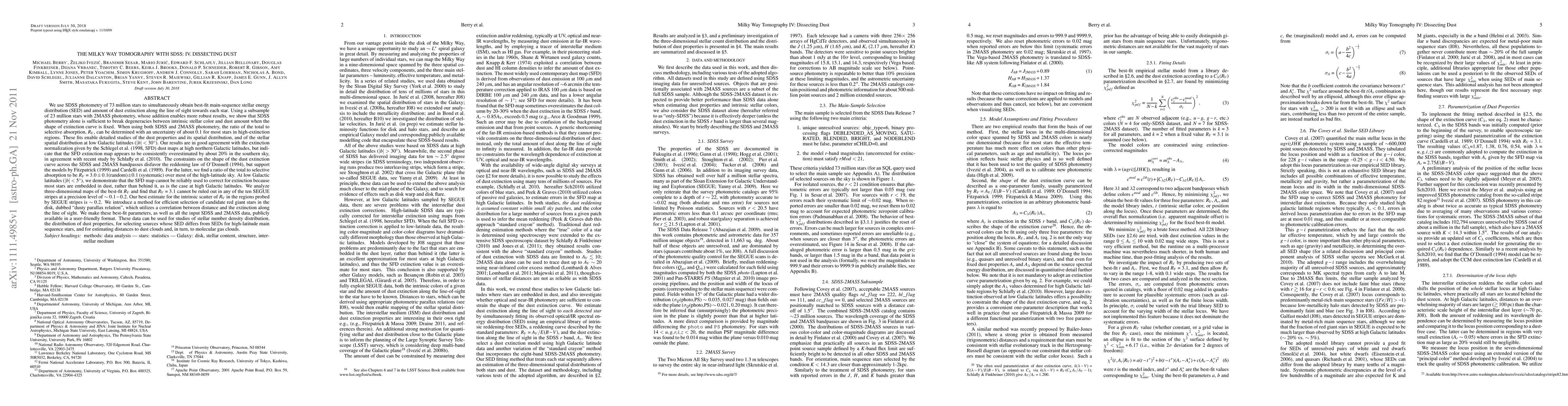 We use SDSS photometry of 73 million stars to simultaneously obtain best-fit main-sequence stellar energy distribution (SED) and amount of dust extinction along the line of sight towards each star. Using a subsample of 23 million stars with 2MASS photometry, whose addition enables more robust results, we show that SDSS photometry alone is sufficient to break degeneracies between intrinsic stellar color and dust amount when the shape of extinction curve is fixed. When using both SDSS and 2MASS photometry, the ratio of the total to selective absorption, $R_V$, can be determined with an uncertainty of about 0.1 for most stars in high-extinction regions. These fits enable detailed studies of the dust properties and its spatial distribution, and of the stellar spatial distribution at low Galactic latitudes. Our results are in good agreement with the extinction normalization given by the Schlegel et al. (1998, SFD) dust maps at high northern Galactic latitudes, but indicate that the SFD extinction map appears to be consistently overestimated by about 20% in the southern sky, in agreement with Schlafly et al. (2010). The constraints on the shape of the dust extinction curve across the SDSS and 2MASS bandpasses support the models by Fitzpatrick (1999) and Cardelli et al. (1989). For the latter, we find an $R_V=3.0\pm0.1$(random) $\pm0.1$(systematic) over most of the high-latitude sky. At low Galactic latitudes (|b|<5), we demonstrate that the SFD map cannot be reliably used to correct for extinction as most stars are embedded in dust, rather than behind it. We introduce a method for efficient selection of candidate red giant stars in the disk, dubbed "dusty parallax relation", which utilizes a correlation between distance and the extinction along the line of sight. We make these best-fit parameters, as well as all the input SDSS and 2MASS data, publicly available in a user-friendly format.