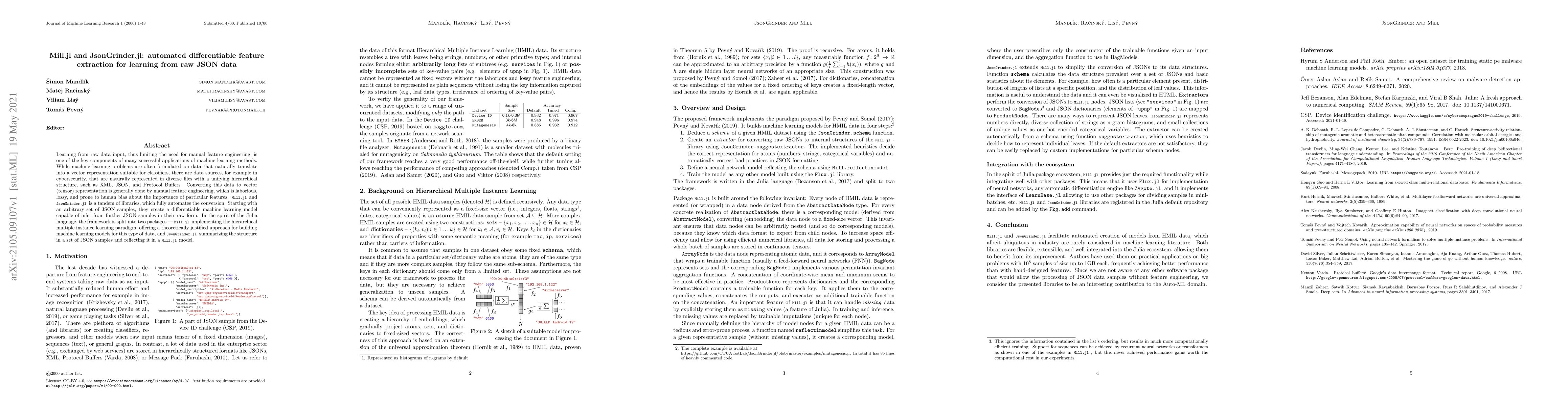 Learning from raw data input, thus limiting the need for manual feature engineering, is one of the key components of many successful applications of machine learning methods. While machine learning problems are often formulated on data that naturally translate into a vector representation suitable for classifiers, there are data sources, for example in cybersecurity, that are naturally represented in diverse files with a unifying hierarchical structure, such as XML, JSON, and Protocol Buffers. Converting this data to vector (tensor) representation is generally done by manual feature engineering, which is laborious, lossy, and prone to human bias about the importance of particular features. Mill and JsonGrinder is a tandem of libraries, which fully automates the conversion. Starting with an arbitrary set of JSON samples, they create a differentiable machine learning model capable of infer from further JSON samples in their raw form.