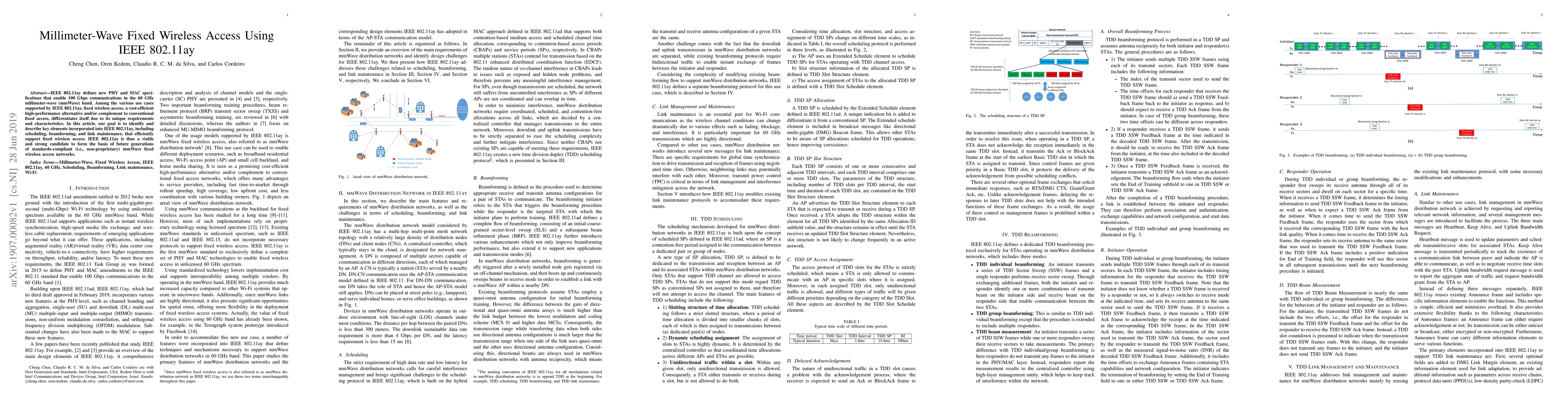 IEEE 802.11ay enables 100 Gbps communications at 60 GHz millimeter-wave frequencies, supporting cost-efficient fixed wireless access networks with efficient scheduling, beamforming, and link maintenance.