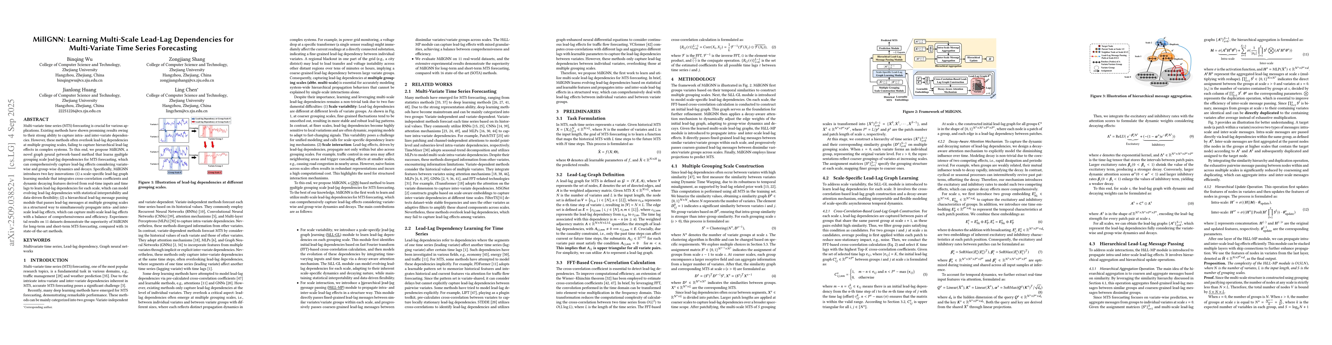 Multi-variate time series (MTS) forecasting is crucial for various applications. Existing methods have shown promising results owing to their strong ability to capture intra- and inter-variate dependencies. However, these methods often overlook lead-lag dependencies at multiple grouping scales, failing to capture hierarchical lead-lag effects in complex systems. To this end, we propose MillGNN, a novel \underline{g}raph \underline{n}eural \underline{n}etwork-based method that learns \underline{m}ult\underline{i}ple grouping scale \underline{l}ead-\underline{l}ag dependencies for MTS forecasting, which can comprehensively capture lead-lag effects considering variate-wise and group-wise dynamics and decays. Specifically, MillGNN introduces two key innovations: (1) a scale-specific lead-lag graph learning module that integrates cross-correlation coefficients and dynamic decaying features derived from real-time inputs and time lags to learn lead-lag dependencies for each scale, which can model evolving lead-lag dependencies with statistical interpretability and data-driven flexibility; (2) a hierarchical lead-lag message passing module that passes lead-lag messages at multiple grouping scales in a structured way to simultaneously propagate intra- and inter-scale lead-lag effects, which can capture multi-scale lead-lag effects with a balance of comprehensiveness and efficiency. Experimental results on 11 datasets demonstrate the superiority of MillGNN for long-term and short-term MTS forecasting, compared with 16 state-of-the-art methods.