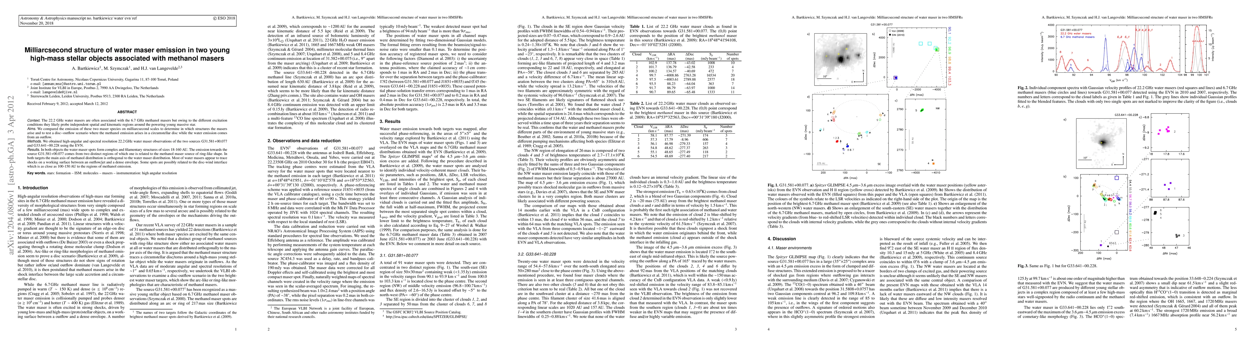 This study uses high-resolution observations to compare 22.2 GHz water maser and 6.7 GHz methanol maser emissions in two high-mass stellar objects, revealing complex filamentary water maser structures and suggesting that water masers trace shocks from outflows while methanol masers arise in circumstellar discs. The orthogonal alignment of methanol and water maser distributions supports a disc-outflow scenario.