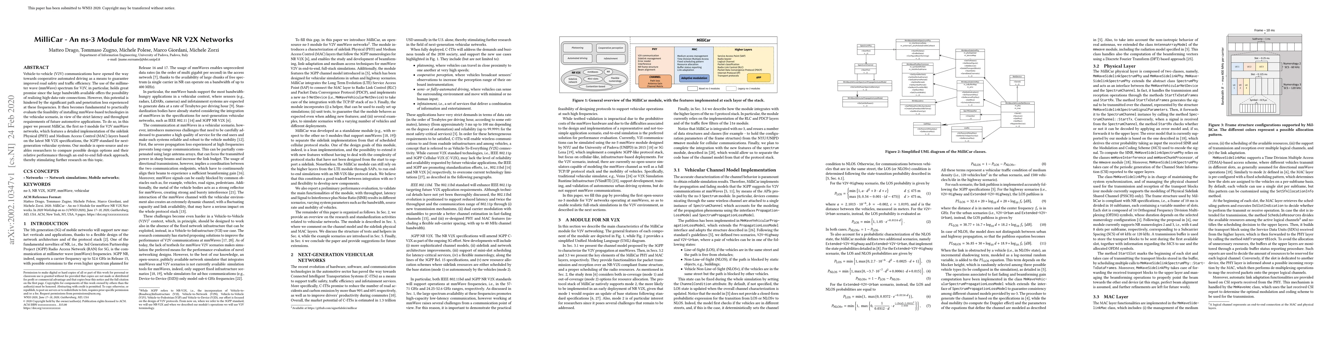 MilliCar is an ns-3 module designed for simulating V2V mmWave networks based on NR V2X specifications, aiming to evaluate the feasibility of high-data-rate mmWave communications in vehicular environments. It facilitates research on the performance and design of mmWave-based V2V communications, addressing challenges like path loss and latency.