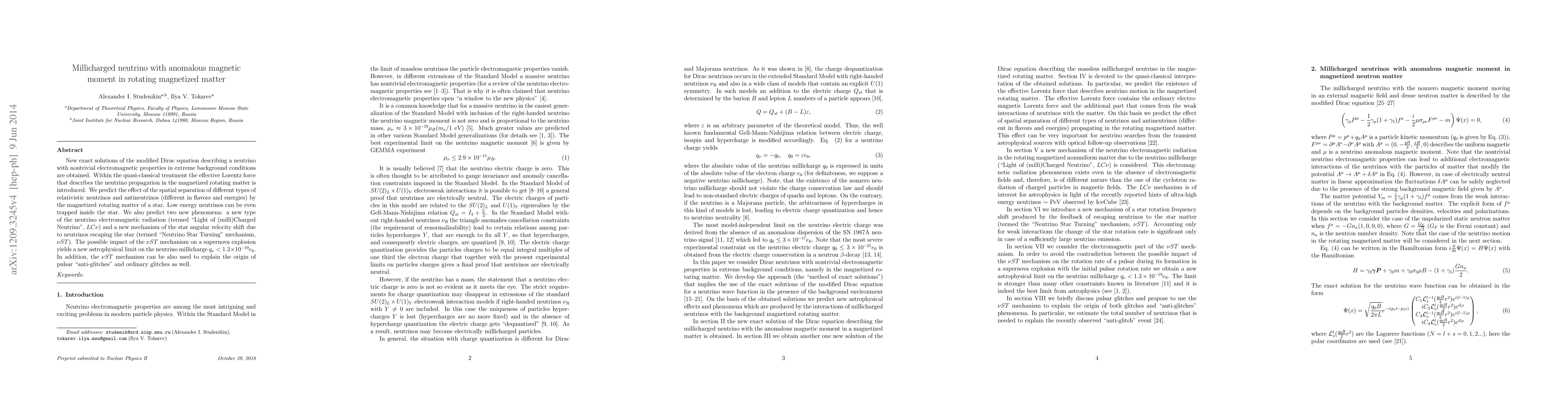 This paper presents new solutions for a neutrino with a millicharge and anomalous magnetic moment in magnetized, rotating matter, predicting spatial separation and trapping of neutrinos in stars. It also introduces the "Light of (milli)Charged Neutrino" and the "Neutrino Star Turning" mechanism, which could impact supernova explosions and explain pulsar glitches.