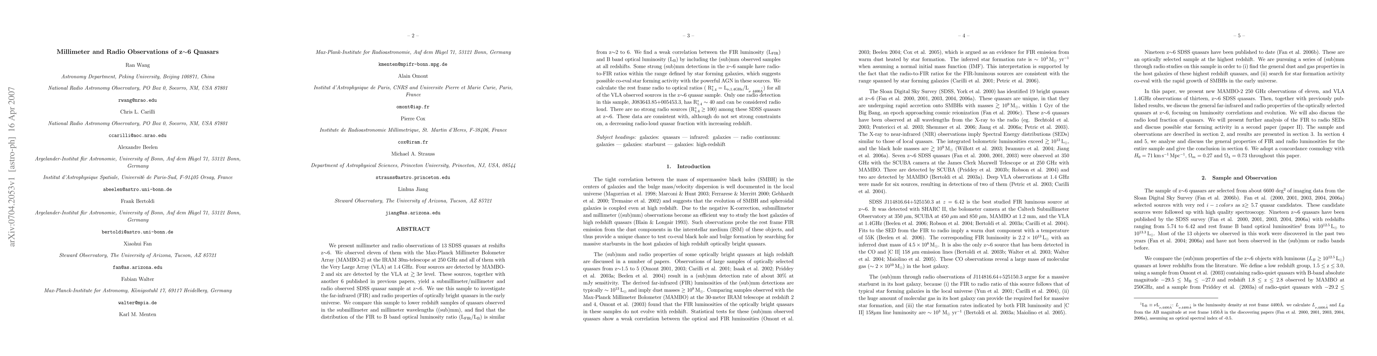 This paper reports millimeter and radio observations of 13 high-redshift quasars (z~6), detecting four with MAMBO-2 and six with VLA. The study finds a similar FIR to optical luminosity ratio across redshifts and suggests co-eval star formation in some quasars, with only one quasar showing radio-loud characteristics.