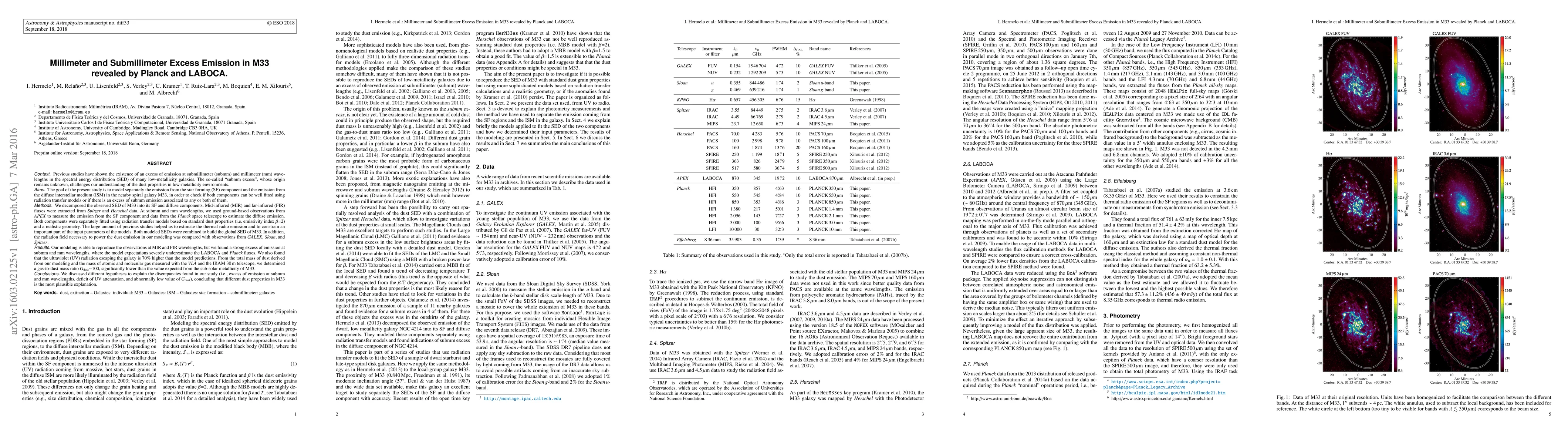 Previous studies have shown the existence of an excess of emission at submillimeter (submm) and millimeter (mm) wavelengths in the spectral energy distribution (SED) of many low-metallicity galaxies. The goal of the present study is to model separately the emission from the star forming (SF) component and the emission from the diffuse interstellar medium (ISM) in the nearby spiral galaxy M33. We decomposed the observed SED of M33 into its SF and diffuse components. Mid-infrared (MIR) and far-infrared (FIR) fluxes were extracted from Spitzer and Herschel data. At submm and mm wavelengths, we used ground-based observations from APEX to measure the emission from the SF component and data from the Planck space telescope to estimate the diffuse emission. Both components were separately fitted using radiation transfer models based on standard dust properties and a realistic geometry. Both modeled SEDs were combined to build the global SED of M33. In addition, the radiation field necessary to power the dust emission in our modeling was compared with observations from GALEX, Sloan, and Spitzer. Our modeling is able to reproduce the observations at MIR and FIR wavelengths, but we found a strong excess of emission at submm and mm wavelengths, where the model expectations severely underestimate the LABOCA and Planck fluxes. We also found that the ultraviolet (UV) radiation escaping the galaxy is 70% higher than the model predictions. We determined a gas-to-dust mass ratio Gdust~100, significantly lower than the value expected from the sub-solar metallicity of M33. We discussed different hypotheses to explain the discrepancies found in our study (i.e., excess of emission at submm and mm wavelengths, deficit of UV attenuation, and abnormally low value of Gdust), concluding that different dust properties in M33 is the most plausible explanation.