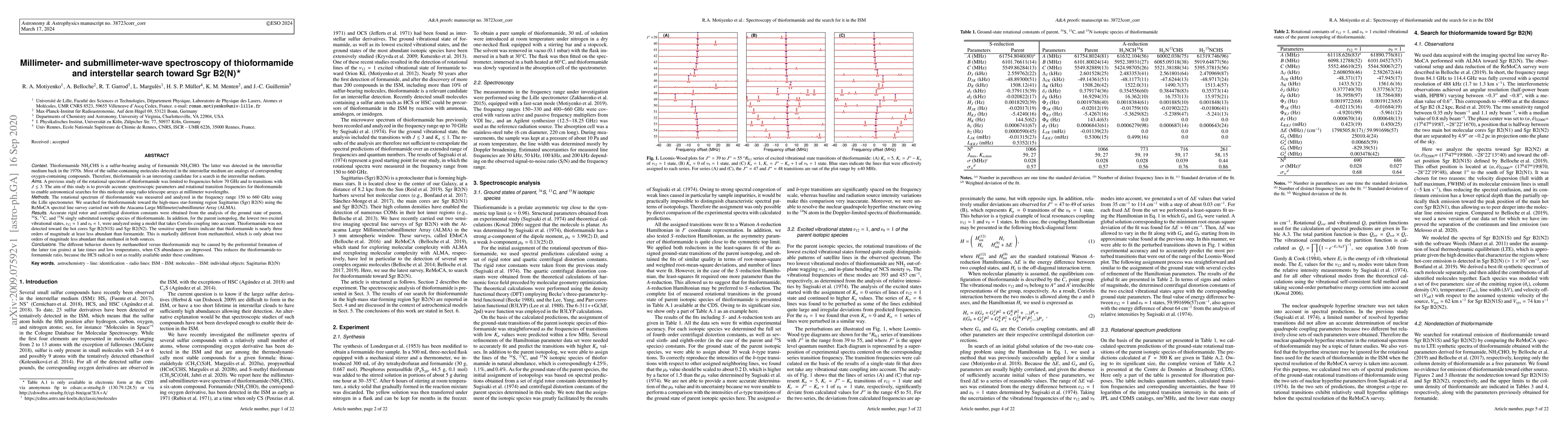 The study employed millimeter- and submillimeter-wave spectroscopy to measure and analyze the rotational spectrum of thioformamide (NH2CHS) in the frequency range 150 to 660 GHz using the Lille spectrometer. The researchers searched for thioformamide toward the high-mass star-forming region Sagittarius (Sgr) B2(N) using the ReMoCA spectral line survey with the Atacama Large Millimeter/submillimeter Array (ALMA).