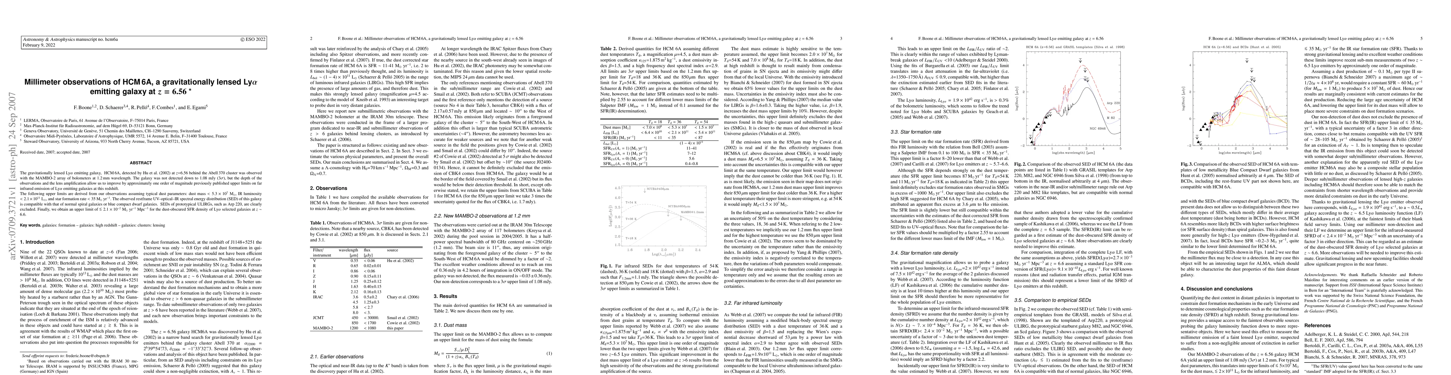 This study uses millimeter observations of the gravitationally lensed Lyman-alpha emitting galaxy HCM6A at z=6.56 to derive upper limits on its far-infrared emission, dust mass, and star formation rate, finding it compatible with normal spiral galaxies. The results exclude prototypical ultra-luminous infrared galaxies (ULIRGs) and provide an upper limit for the dust-obscured star formation rate density.