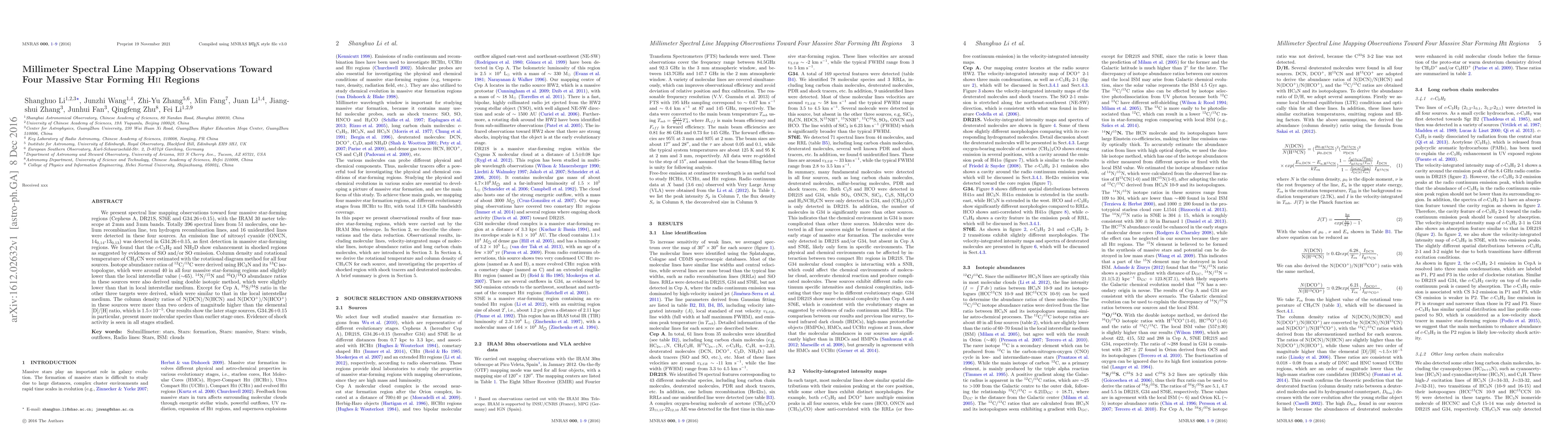 Researchers used a 30-meter telescope to observe millimeter spectral lines from four massive star-forming regions, detecting 396 new species and finding evidence of shock activity in all stages.