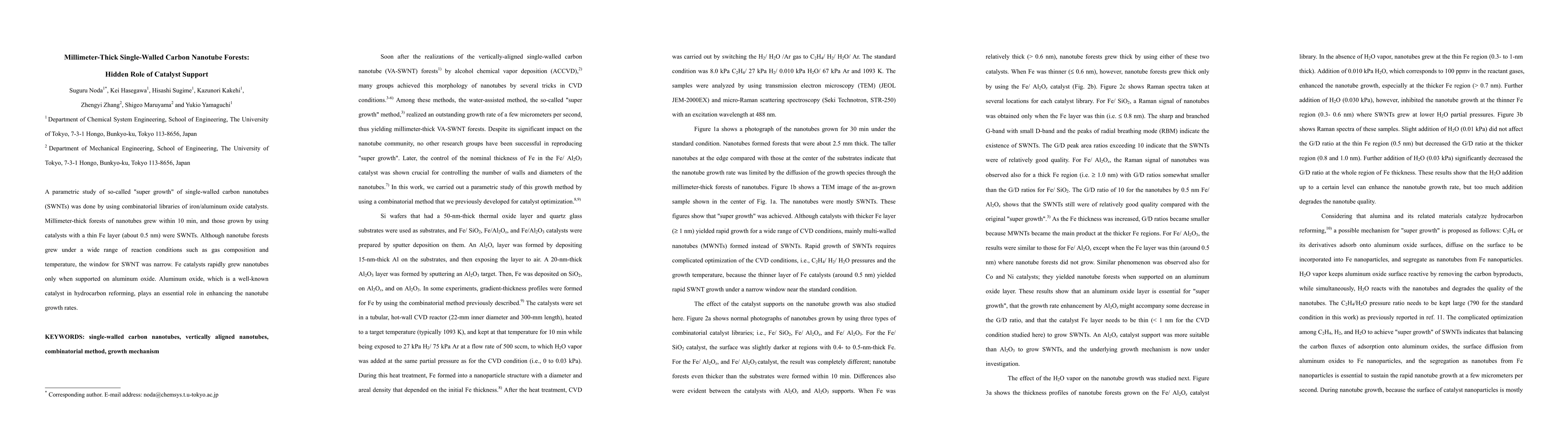 A parametric study of so-called "super growth" of single-walled carbon nanotubes(SWNTs) was done by using combinatorial libraries of iron/aluminum oxide catalysts. Millimeter-thick forests of nanotubes grew within 10 min, and those grown by using catalysts with a thin Fe layer (about 0.5 nm) were SWNTs. Although nanotube forests grew under a wide range of reaction conditions such as gas composition and temperature, the window for SWNT was narrow. Fe catalysts rapidly grew nanotubes only when supported on aluminum oxide. Aluminum oxide, which is a well-known catalyst in hydrocarbon reforming, plays an essential role in enhancing the nanotube growth rates.