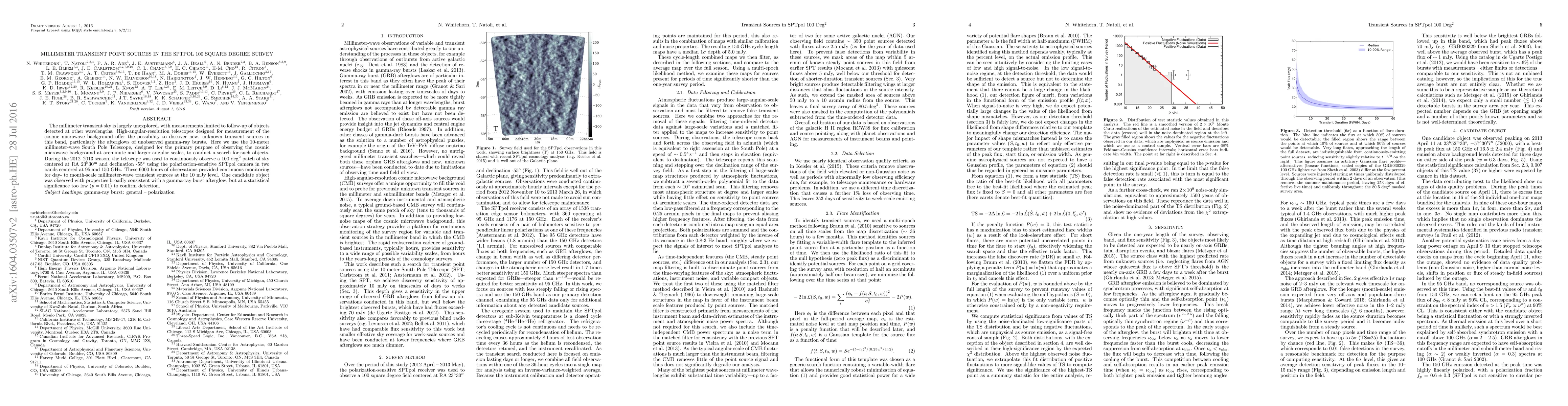 Researchers used the 10-meter South Pole Telescope to search for millimeter-wave transient sources in a 100 square degree patch of sky, detecting one candidate object that showed properties consistent with a gamma-ray burst afterglow but lacked statistical significance.
