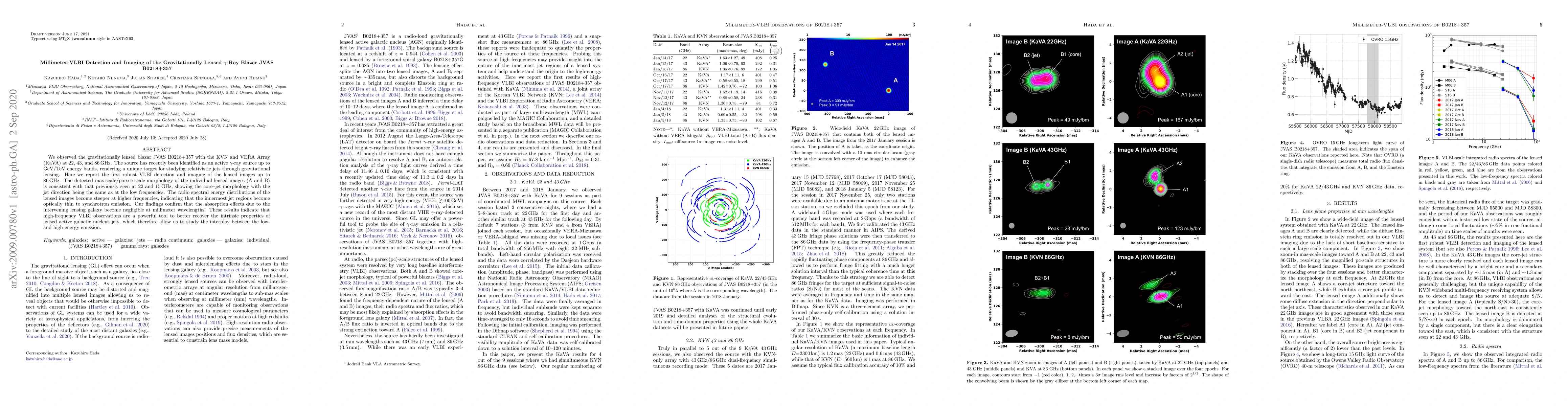 This paper reports the first millimeter-VLBI detection and imaging of the gravitationally lensed blazar JVAS B0218+357 at 22, 43, and 86 GHz, revealing consistent core-jet morphology across frequencies. The study shows that higher frequencies lead to steeper radio spectral energy distributions, indicating optically thin innermost jet regions, and negligible lensing absorption at millimeter wavelengths.