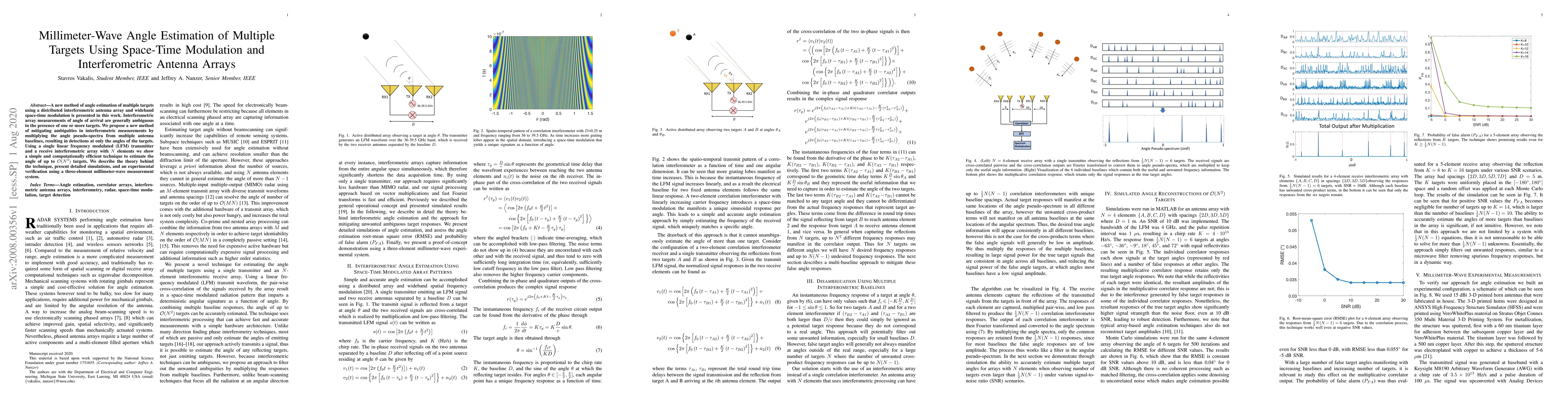 This paper proposes a novel method for angle estimation of multiple targets using a distributed interferometric antenna array and wideband space-time modulation, which mitigates ambiguities by multiplying angle pseudo-spectra from multiple antenna baselines, enabling the detection of target angles efficiently. Simulations and experimental verification using a three-element millimeter-wave system demonstrate the technique's effectiveness.