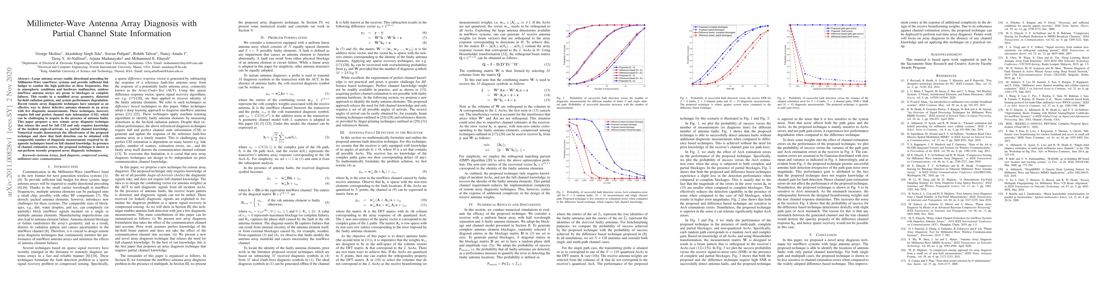 This paper proposes a novel remote diagnosis technique for mmWave antenna arrays that requires only partial channel state information (CSI) instead of full CSI, enabling effective fault detection with fewer diagnostic measurements and outperforming existing techniques in the presence of channel estimation errors.