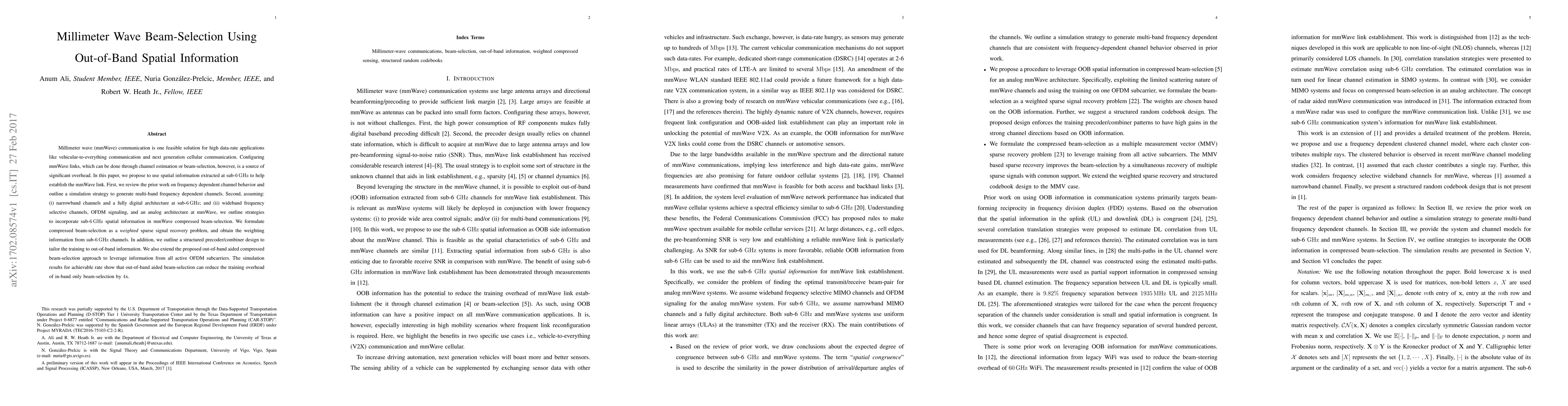 This paper proposes using spatial information from sub-6 GHz frequencies to assist in millimeter wave (mmWave) beam-selection, reducing training overhead. It formulates the problem as a weighted sparse signal recovery and demonstrates a 4x reduction in training overhead compared to in-band only methods through simulations.