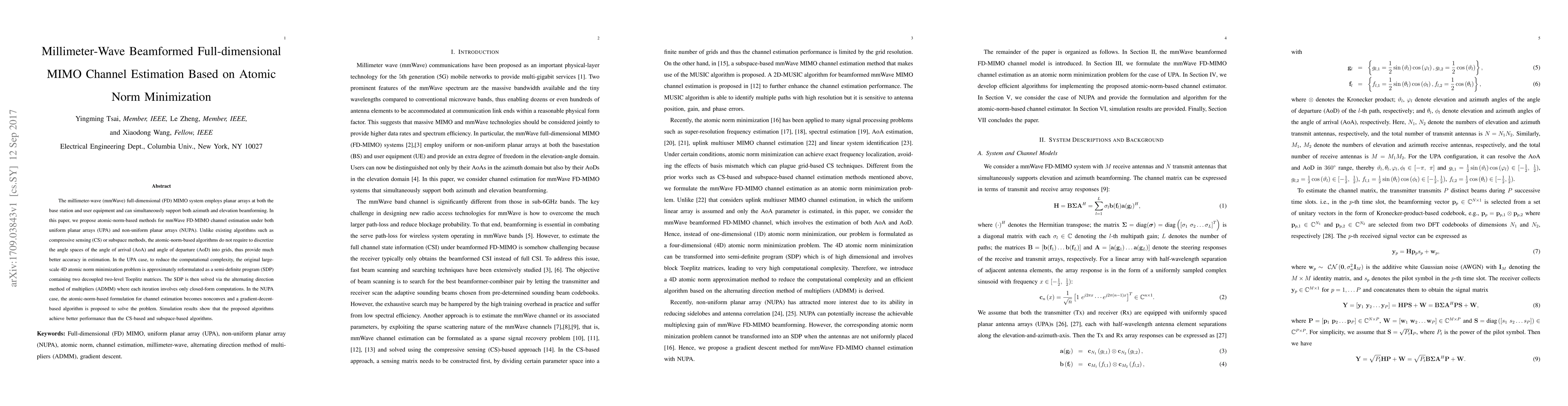 This paper proposes atomic-norm-based methods for millimeter-wave full-dimensional MIMO channel estimation, offering improved accuracy without angle space discretization. For uniform planar arrays, it reformulates the problem into a solvable semi-definite program using ADMM, while for non-uniform arrays, it employs a gradient-descent algorithm, demonstrating superior performance over compressive sensing and subspace methods.