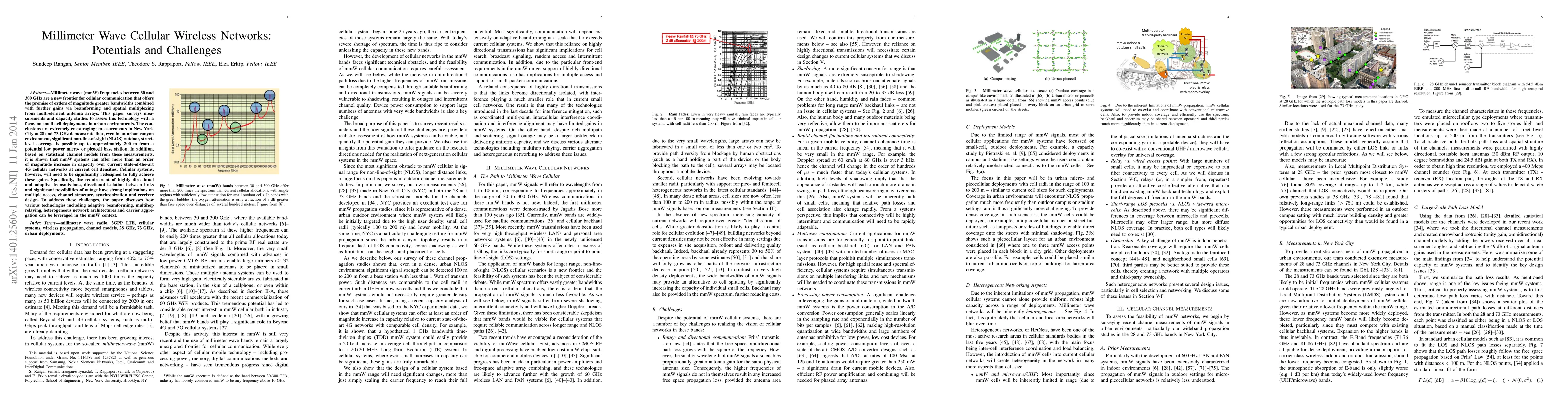 This paper surveys millimeter wave (mmW) cellular wireless networks, highlighting their potential for significantly increased bandwidth and capacity through beamforming and spatial multiplexing. Despite promising results from urban measurements, it emphasizes the need for a complete redesign of cellular systems to address challenges like directional transmissions and potential outages.