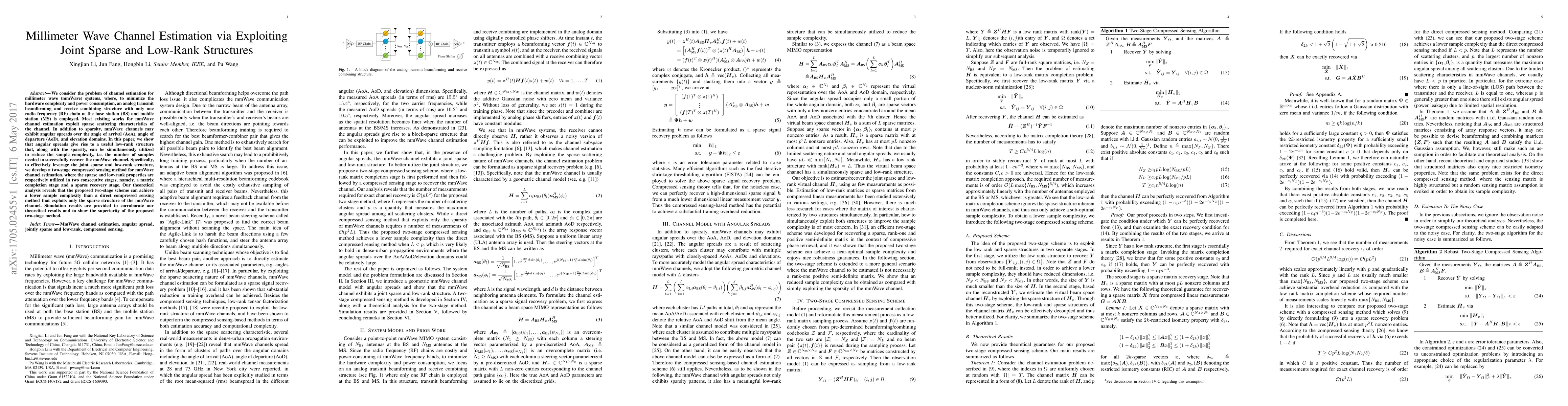 We consider the problem of channel estimation for millimeter wave (mmWave) systems, where, to minimize the hardware complexity and power consumption, an analog transmit beamforming and receive combining structure with only one radio frequency (RF) chain at the base station (BS) and mobile station (MS) is employed. Most existing works for mmWave channel estimation exploit sparse scattering characteristics of the channel. In addition to sparsity, mmWave channels may exhibit angular spreads over the angle of arrival (AoA), angle of departure (AoD), and elevation domains. In this paper, we show that angular spreads give rise to a useful low-rank structure that, along with the sparsity, can be simultaneously utilized to reduce the sample complexity, i.e. the number of samples needed to successfully recover the mmWave channel. Specifically, to effectively leverage the joint sparse and low-rank structure, we develop a two-stage compressed sensing method for mmWave channel estimation, where the sparse and low-rank properties are respectively utilized in two consecutive stages, namely, a matrix completion stage and a sparse recovery stage. Our theoretical analysis reveals that the proposed two-stage scheme can achieve a lower sample complexity than a direct compressed sensing method that exploits only the sparse structure of the mmWave channel. Simulation results are provided to corroborate our theoretical results and to show the superiority of the proposed two-stage method.