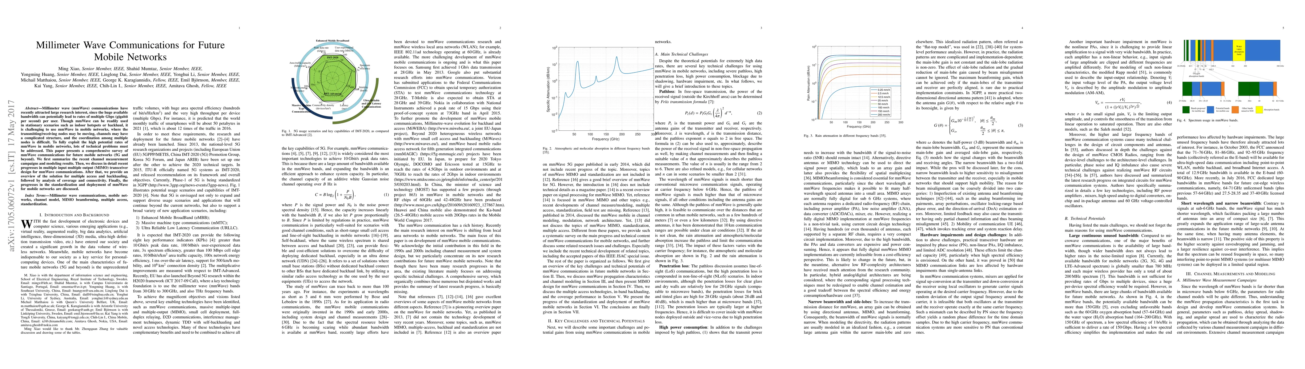 This paper provides a comprehensive survey on millimeter wave (mmWave) communications for future mobile networks, summarizing recent channel measurement results and multiple input multiple output (MIMO) transceiver design advancements. It also addresses challenges in multiple access, backhauling, coverage, and connectivity for mobile scenarios.