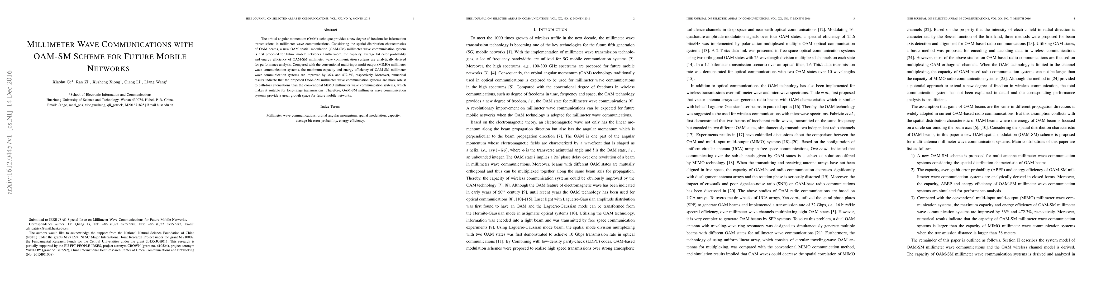 This paper proposes an OAM spatial modulation (OAM-SM) scheme for millimeter wave communications in future mobile networks, demonstrating a 36% improvement in capacity and a 472.3% increase in energy efficiency compared to conventional MIMO systems. It also shows greater robustness to path-loss, making it suitable for long-range transmissions.