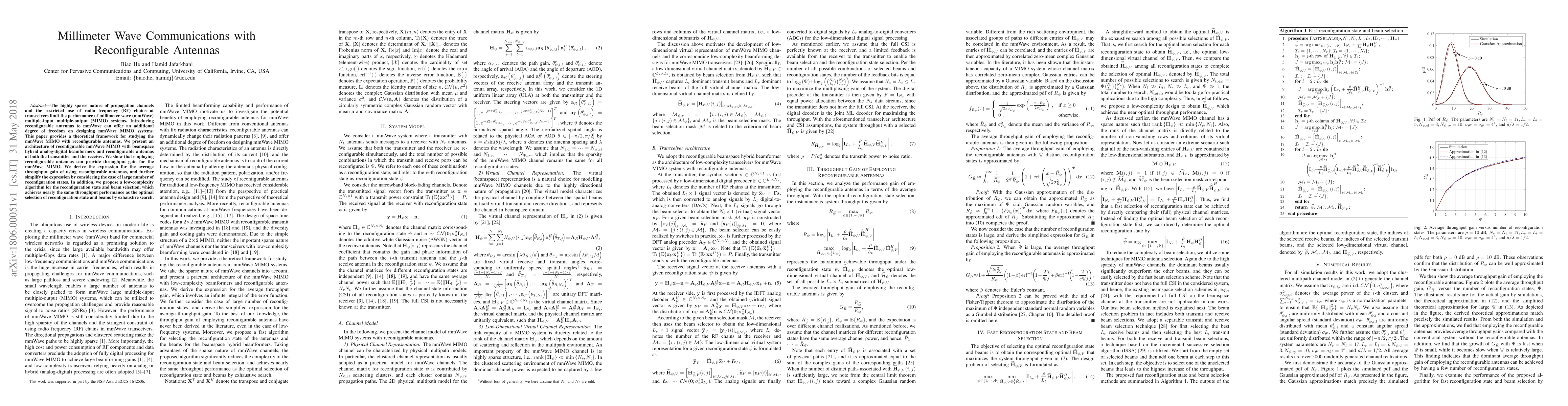 This paper explores the use of reconfigurable antennas in millimeter wave (mmWave) MIMO systems to enhance performance through additional design flexibility. The authors propose a theoretical framework and architecture for mmWave MIMO with reconfigurable antennas, demonstrating throughput gains and presenting a low-complexity algorithm for state and beam selection.