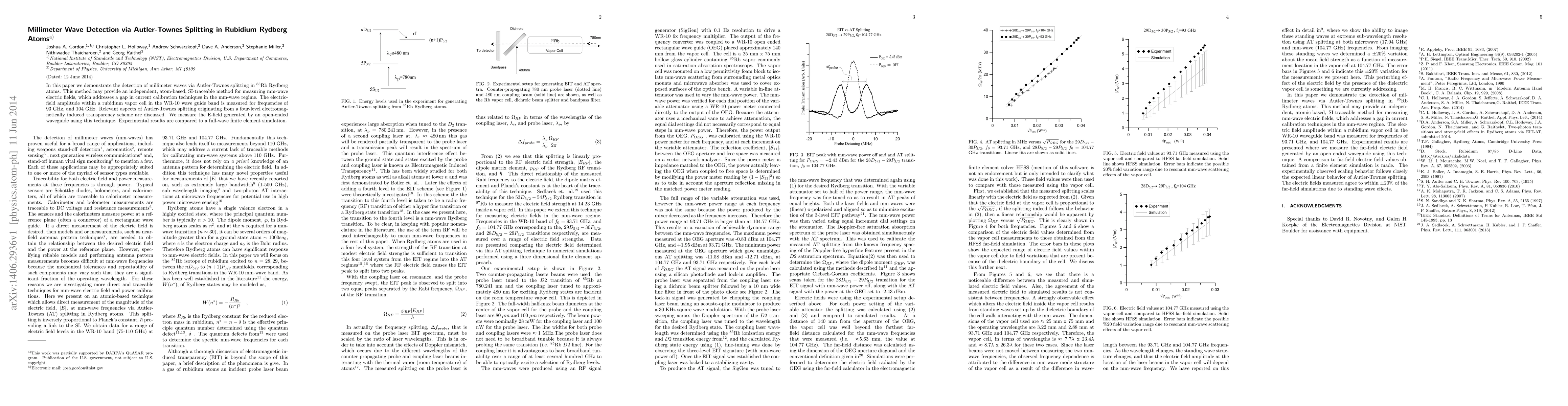 This paper presents a novel method for detecting millimeter waves through Autler-Townes splitting in 85Rb Rydberg atoms, offering a traceable calibration technique for mm-wave electric fields. Experimental results show successful measurement of E-field amplitudes at 93 GHz and 104 GHz, validated by finite element simulation.
