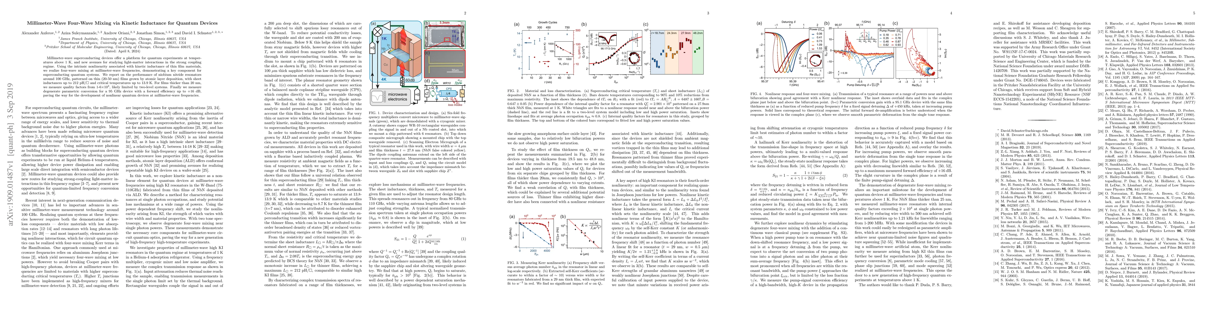 Millimeter-wave superconducting devices offer a platform for quantum experiments at temperatures above 1 K, and new avenues for studying light-matter interactions in the strong coupling regime. Using the intrinsic nonlinearity associated with kinetic inductance of thin film materials, we realize four-wave mixing at millimeter-wave frequencies, demonstrating a key component for superconducting quantum systems. We report on the performance of niobium nitride resonators around 100 GHz, patterned on thin (20-50 nm) films grown by atomic layer deposition, with sheet inductances up to 212 pH/square and critical temperatures up to 13.9 K. For films thicker than 20 nm, we measure quality factors from $1$-$6\times 10^4$, likely limited by two-level systems. Finally we measure degenerate parametric conversion for a 95 GHz device with a forward efficiency up to +16 dB, paving the way for the development of nonlinear quantum devices at millimeter-wave frequencies.