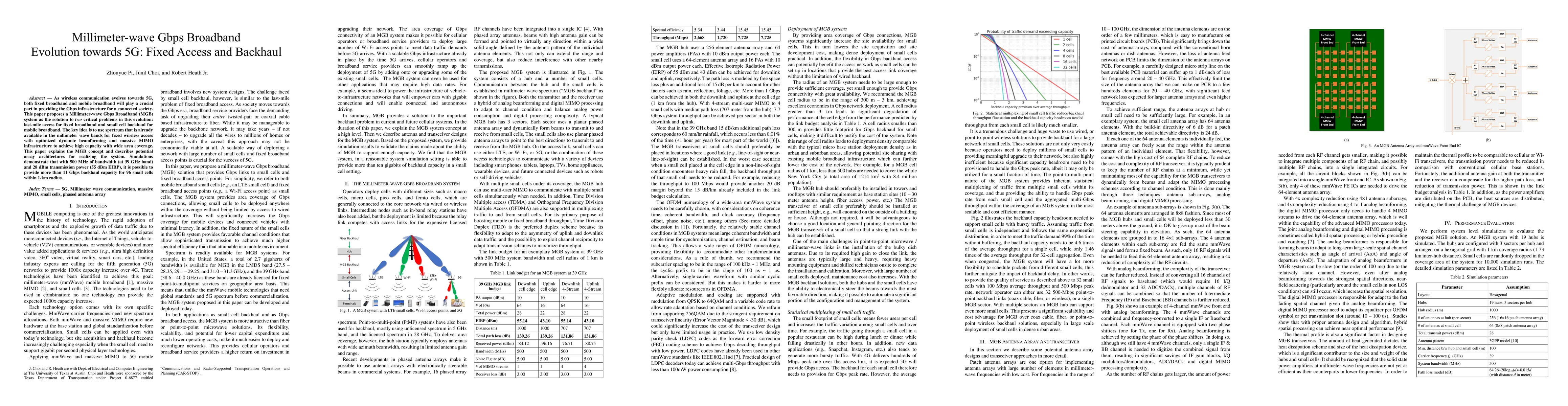 This paper proposes a Millimeter-wave Gbps Broadband (MGB) system to address last-mile fixed broadband and small cell backhaul for 5G, utilizing millimeter wave spectrum with dynamic beamforming and massive MIMO for high capacity and wide coverage. Simulations show it can provide over 11 Gbps backhaul for 96 small cells within a 1-km radius.