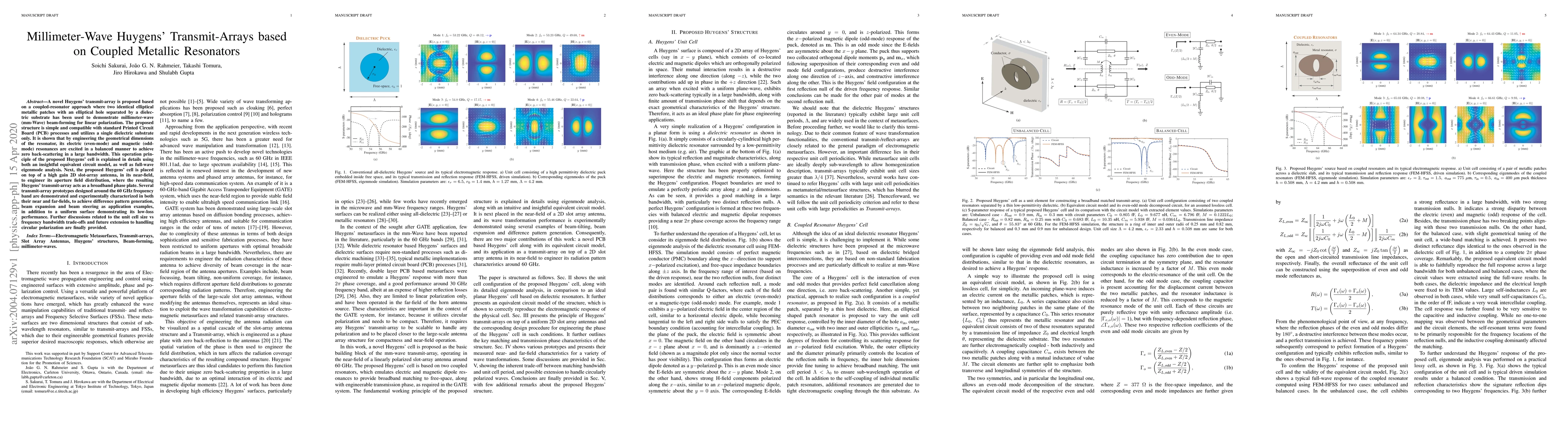 A novel Huygens' transmit-array is proposed based on a coupled-resonator approach where two identical elliptical metallic patches with an elliptical hole separated by a dielectric substrate has been used to demonstrate millimeter-wave (mm-Wave) beam-forming for linear polarization. The proposed structure is simple and compatible with standard Printed Circuit Board (PCB) processes and utilizes a single dielectric substrate only. It is shown that by engineering the geometrical dimensions of the resonator, its electric (even-mode) and magnetic (odd-mode) resonances are excited in a balanced manner to achieve zero back-scattering in a large bandwidth. This operation principle of the proposed Huygens' cell is explained in details using both an insightful equivalent circuit model, as well as full-wave eigenmode analysis. Next, the proposed Huygens' cell is placed on top of a high gain 2D slot-array antenna, in its near-field, to engineer its aperture field distribution, where the resulting Huygens' transmit-array acts as a broadband phase plate. Several transmit-array prototypes designed around the 60 GHz frequency band are demonstrated and experimentally characterized in both their near and far-fields, to achieve difference pattern generation, beam expansion and beam steering as application examples, in addition to a uniform surface demonstrating its low-loss performance. Further discussions related to the unit cell size vs frequency bandwidth trade-offs and future extension to handling circular polarization are finally provided.