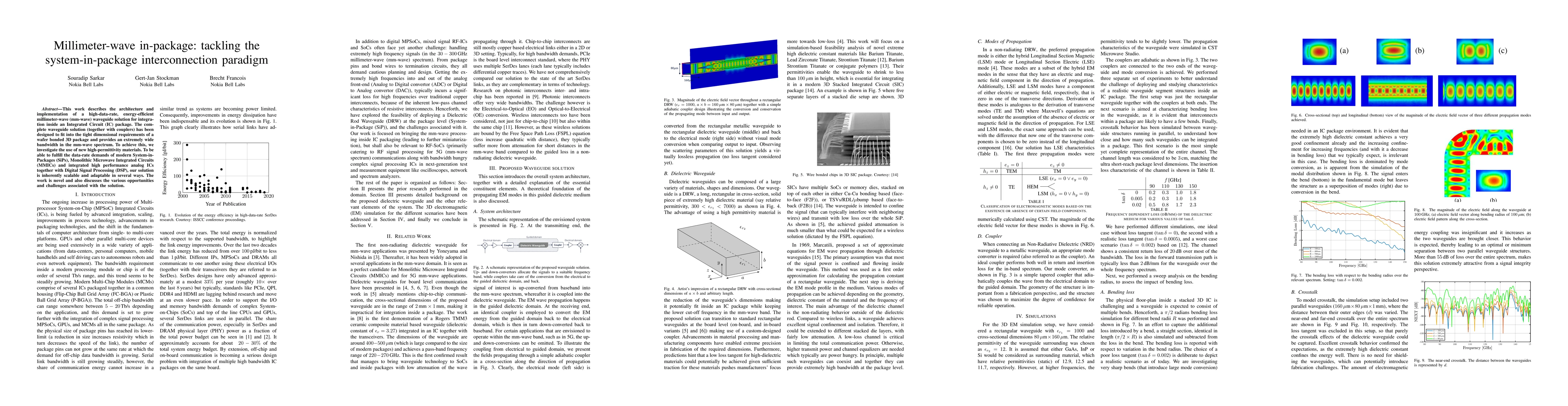 This work describes the architecture and implementation of a high-data-rate, energy-efficient millimeter-wave (mm-wave) waveguide solution for integration inside an Integrated Circuit (IC) package. The complete waveguide solution (together with couplers) has been designed to fit into the tight dimensional requirements of a wafer bonded 3D package and provides an extremely wide bandwidth in the mm-wave spectrum. To achieve this, we investigate the use of new high-permittivity materials. To be able to fulfill the data-rate demands of modern System-in-Packages (SiPs), Monolithic Microwave Integrated Circuits(MMICs) and integrated high performance analog ICs together with Digital Signal Processing (DSP), our solution is inherently scalable and adaptable in several ways. The work is novel and also discusses the various opportunities and challenges associated with the solution.