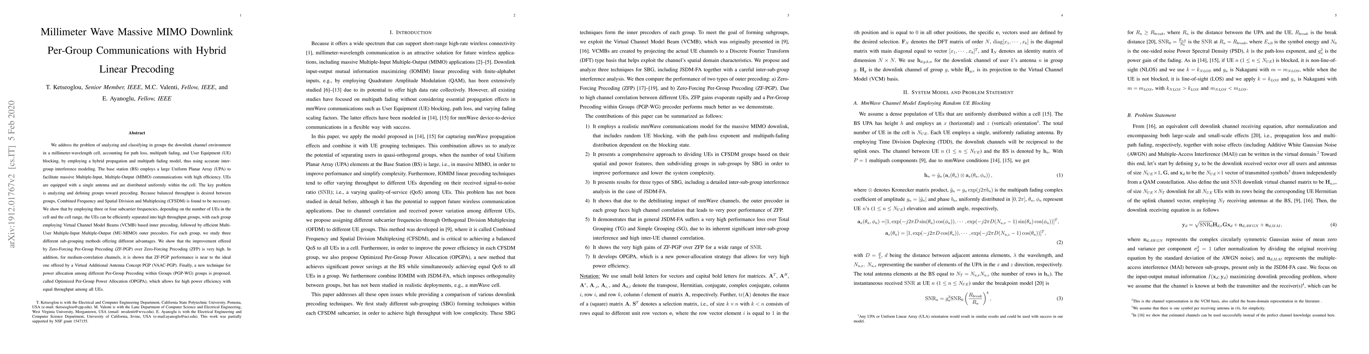 We address the problem of analyzing and classifying in groups the downlink channel environment in a millimeter-wavelength cell, accounting for path loss, multipath fading, and User Equipment (UE) blocking, by employing a hybrid propagation and multipath fading model, thus using accurate inter-group interference modeling. The base station (BS) employs a large Uniform Planar Array (UPA) to facilitate massive Multiple-Input, Multiple-Output (MIMO) communications with high efficiency. UEs are equipped with a single antenna and are distributed uniformly within the cell. The key problem is analyzing and defining groups toward precoding. Because equitable type of throughput is desired between groups, Combined Frequency and Spatial Division and Multiplexing (CFSDM) prevails as necessary. We show that by employing three subcarrier frequencies, the UEs can be efficiently separated into high throughput groups, with each group employing Virtual Channel Model Beams (VCMB) based inner precoding, followed by efficient Multi-User Multiple-Input Multiple-Output (MU-MIMO) outer precoders. For each group, we study three different sub-grouping methods offering different advantages. We show that the improvement offered by Zero-Forcing Per-Group Precoding (ZF-PGP) over Zero-Forcing Precoding (ZFP) is very high.