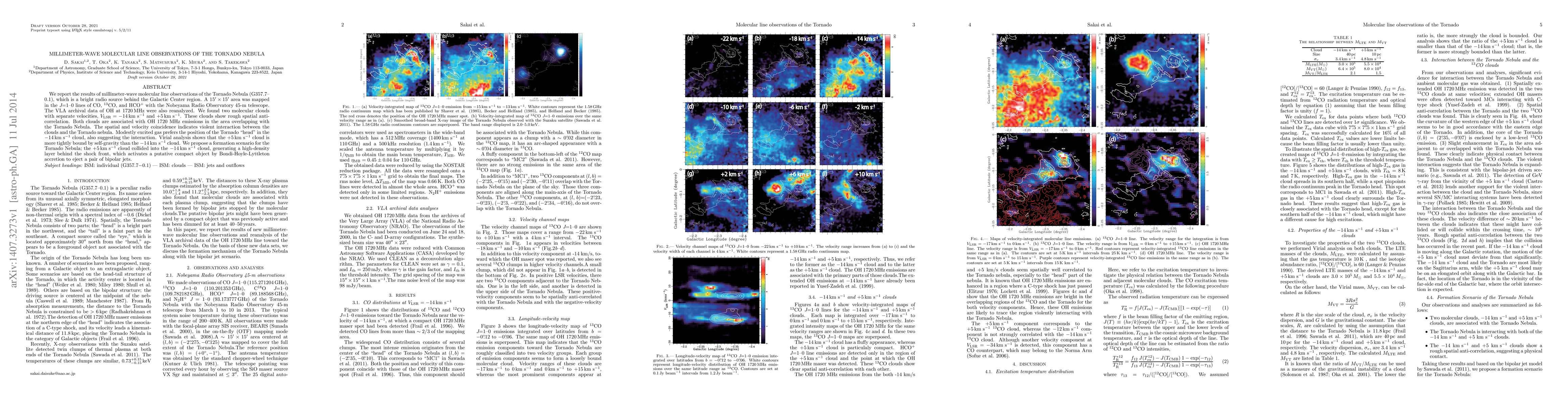 We report the results of millimeter-wave molecular line observations of the Tornado Nebula (G357.7--0.1), which is a bright radio source behind the Galactic Center region. A 15'x15' area was mapped in the J=1--0 lines of CO, 13CO, and HCO+ with the Nobeyama Radio Observatory 45-m telescope. The VLA archival data of OH at 1720 MHz were also reanalyzed. We found two molecular clouds with separate velocities, V_LSR=-14 km/s and +5 km/s. These clouds show rough spatial anti-correlation. Both clouds are associated with OH 1720 MHz emissions in the area overlapping with the Tornado Nebula. The spatial and velocity coincidence indicates violent interaction between the clouds and the Tornado nebula. Modestly excited gas prefers the position of the Tornado "head" in the -14 km/s cloud, also suggesting the interaction. Virial analysis shows that the +5 km/s cloud is more tightly bound by self-gravity than the -14 km/s cloud. We propose a formation scenario for the Tornado Nebula; the +5 km/s cloud collided into the -14 km/s cloud, generating a high-density layer behind the shock front, which activates a putative compact object by Bondi-Hoyle-Lyttleton accretion to eject a pair of bipolar jets.