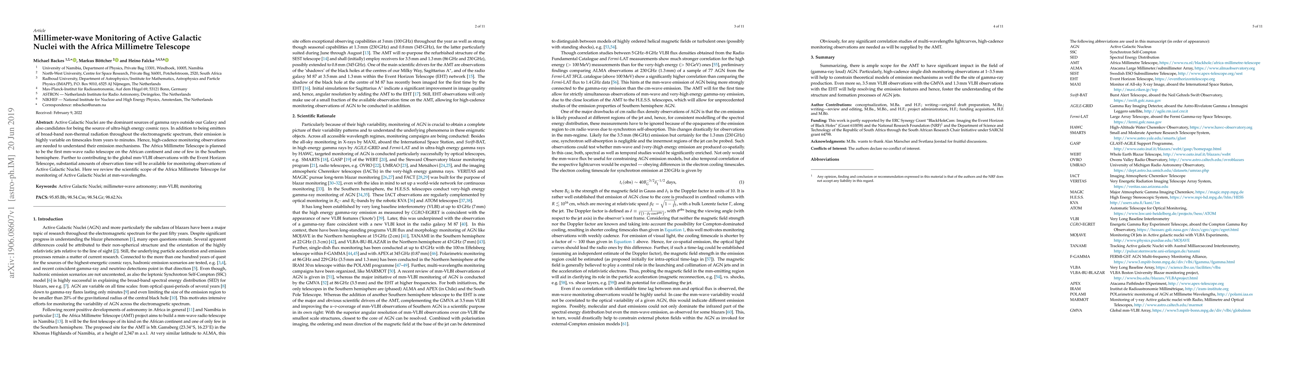Active Galactic Nuclei are the dominant sources of gamma rays outside our Galaxy and also candidates for being the source of ultra-high energy cosmic rays. In addition to being emitters of broad-band non-thermal radiation throughout the electromagnetic spectrum, their emission is highly variable on timescales from years to minutes. Hence, high-cadence monitoring observations are needed to understand their emission mechanisms. The Africa Millimetre Telescope is planned to be the first mm-wave radio telescope on the African continent and one of few in the Southern hemisphere. Further to contributing to the global mm-VLBI observations with the Event Horizon Telescope, substantial amounts of observation time will be available for monitoring observations of Active Galactic Nuclei. Here we review the scientific scope of the Africa Millimetre Telescope for monitoring of Active Galactic Nuclei at mm-wavelengths.
