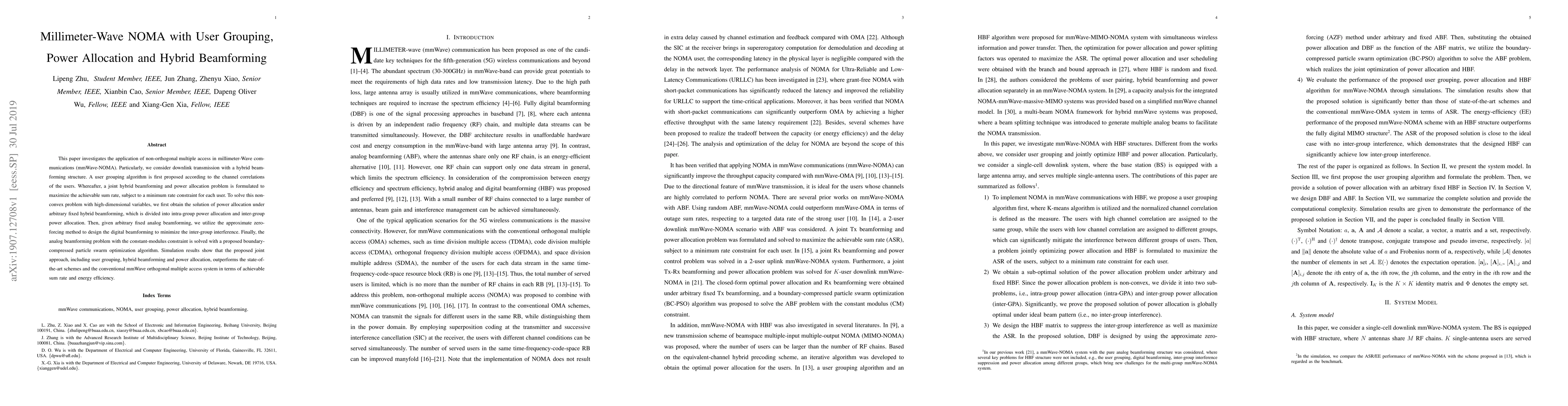 This paper proposes a user grouping algorithm and a joint hybrid beamforming and power allocation scheme for millimeter-wave NOMA to maximize sum rate. Simulation results show significant improvements over state-of-the-art and conventional systems in sum rate and energy efficiency.