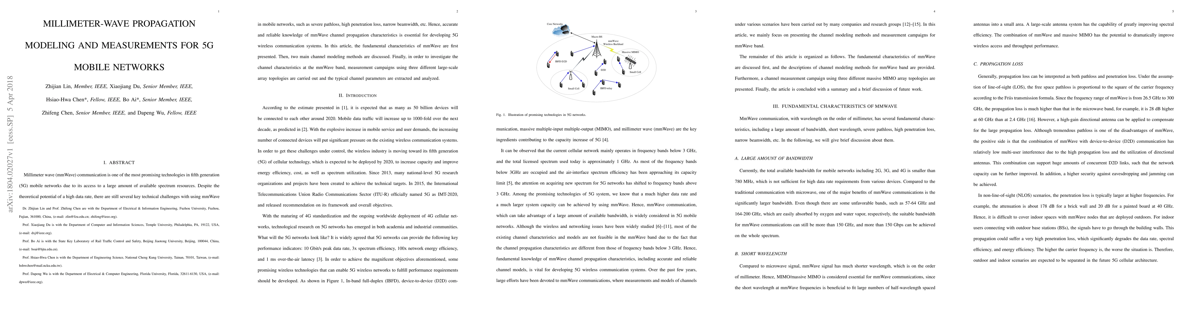 This paper explores the propagation characteristics of millimeter-wave (mmWave) communication for 5G networks, discussing fundamental channel modeling methods and presenting measurement results from campaigns using large-scale array topologies to analyze typical channel parameters.