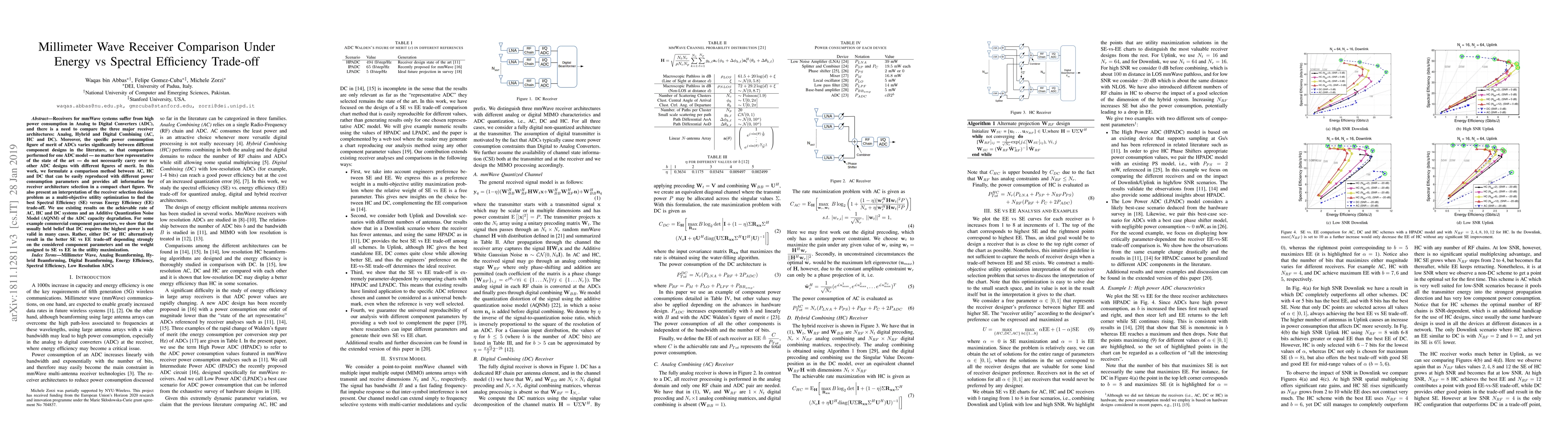 The paper introduces a method to compare AC, HC, and DC receivers under energy vs spectral efficiency trade-off, utilizing a multi-objective utility optimization approach and considering varying ADC power consumption parameters.