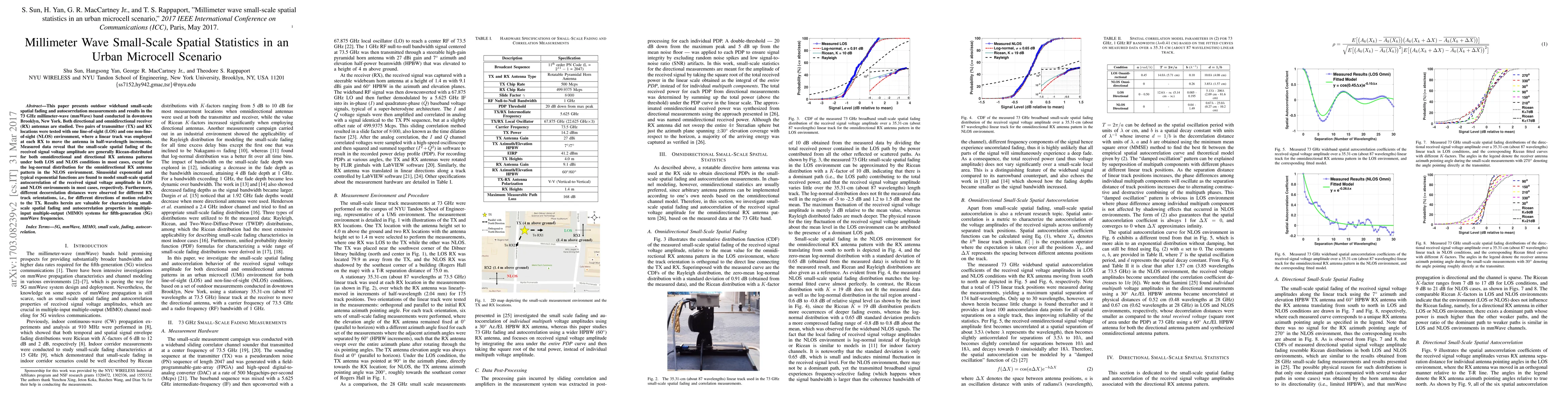 This paper measures small-scale spatial fading and autocorrelation in millimeter wave frequencies in an urban environment, revealing Ricean distribution for signal amplitude and sinusoidal exponential functions modeling autocorrelation.
