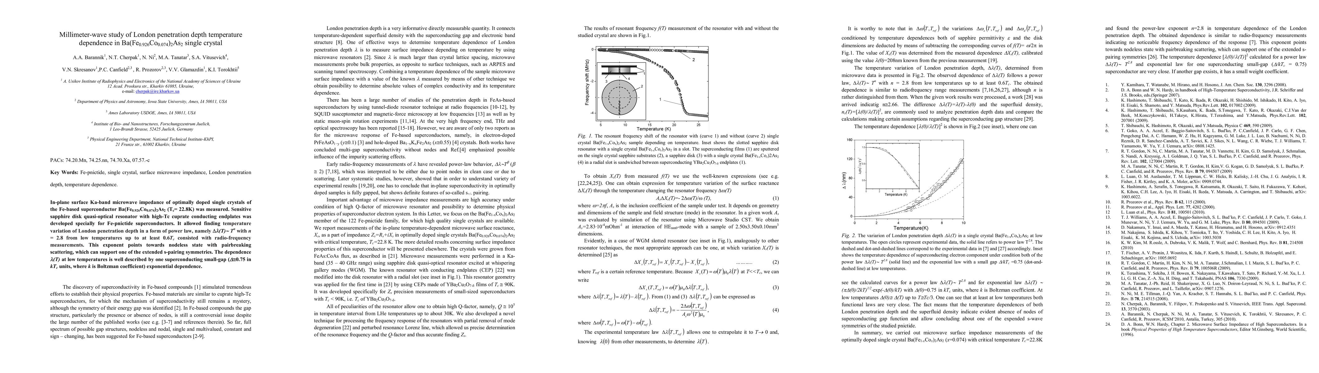 This study investigates the temperature dependence of London penetration depth in optimally doped Ba(Fe0.926Co0.074)2As2 single crystals using a specially developed microwave resonator. The findings reveal a power-law temperature variation consistent with radio-frequency measurements, suggesting a nodeless state and supporting extended s-pairing symmetry.