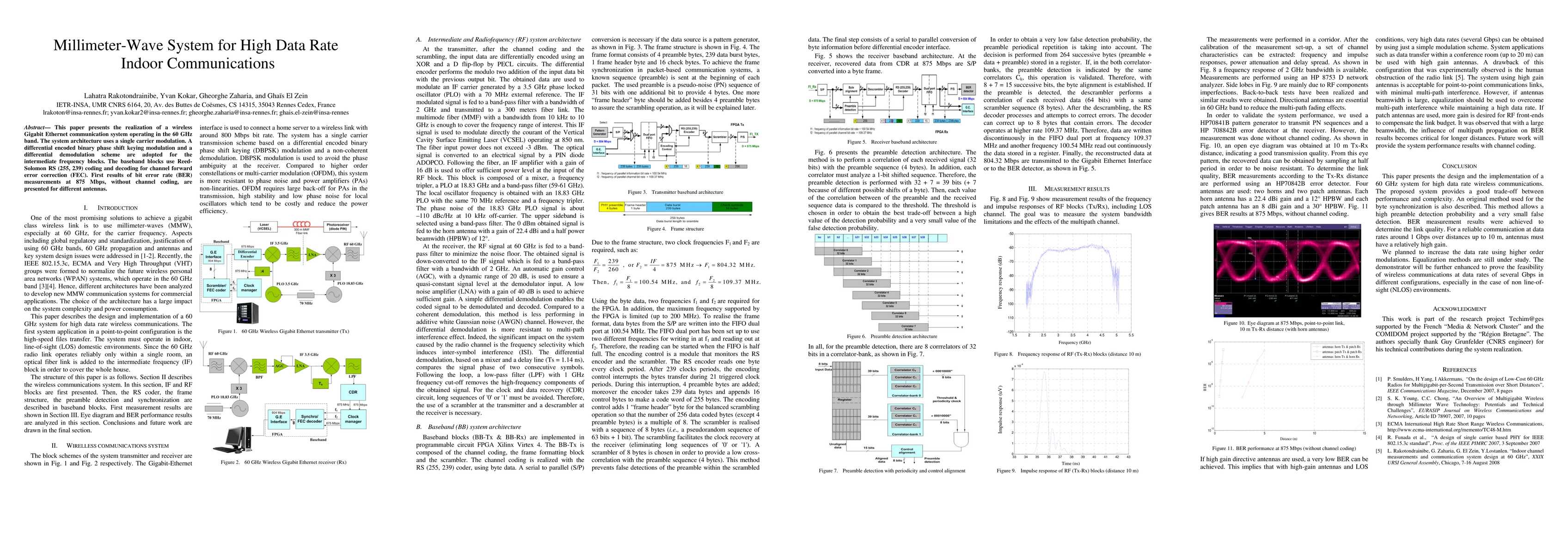This paper presents the realization of a wireless Gigabit Ethernet communication system operating in the 60 GHz band. The system architecture uses a single carrier modulation. A differential encoded binary phase shift keying modulation and a differential demodulation scheme are adopted for the intermediate frequency blocks. The baseband blocks use Reed- Solomon RS (255, 239) coding and decoding for channel forward error correction (FEC). First results of bit error rate (BER) measurements at 875 Mbps, without channel coding, are presented for different antennas.