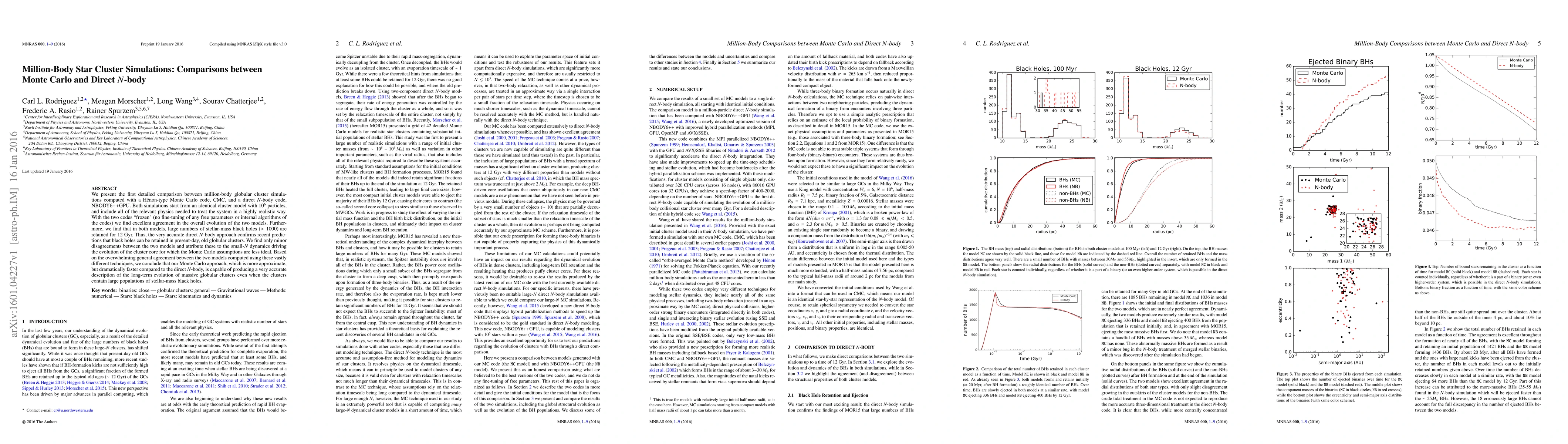 This paper compares the results of million-body globular cluster simulations using a Monte Carlo code and a direct $N$-body code, finding excellent agreement in the overall evolution despite minor disagreements attributed to small-$N$ dynamics. The study confirms that both methods can accurately describe the long-term evolution of clusters, including the retention of stellar-mass black holes.