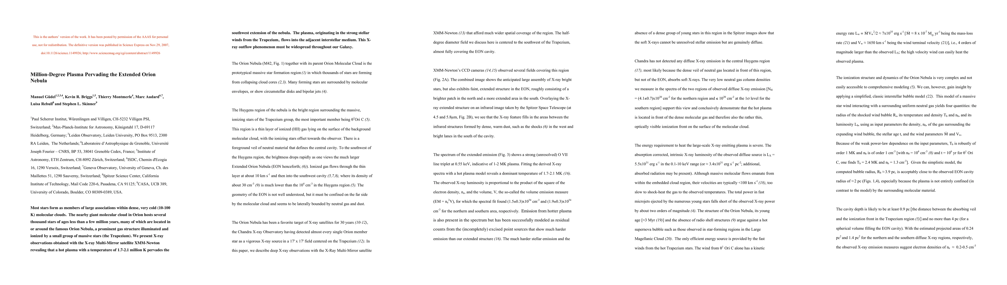 This paper reports XMM-Newton observations revealing a hot plasma of 1.7-2.1 million K in the southwest extension of the Orion Nebula, likely originating from the stellar winds of the Trapezium stars. This outflow of plasma into the interstellar medium suggests a common phenomenon in star-forming regions across the Galaxy.
