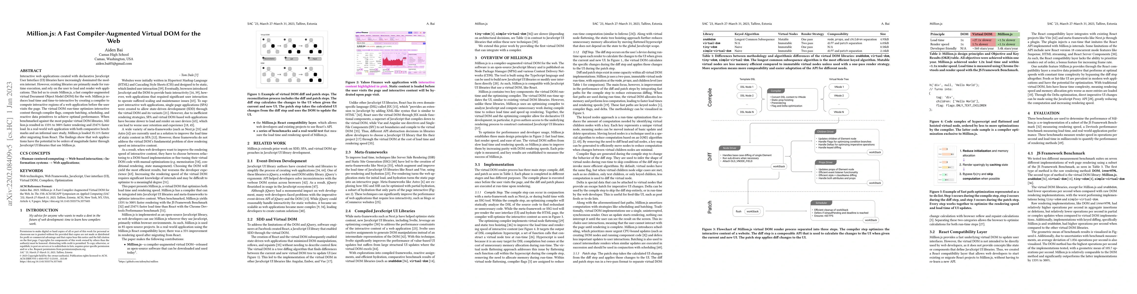 Million.js is a fast compiler-augmented virtual DOM designed to significantly reduce load times and improve interactivity in web applications by pre-computing interactive regions. Benchmarks show that it renders 133% to 300% faster and loads 2347% faster than popular alternatives, demonstrating substantial performance gains for modern web applications.