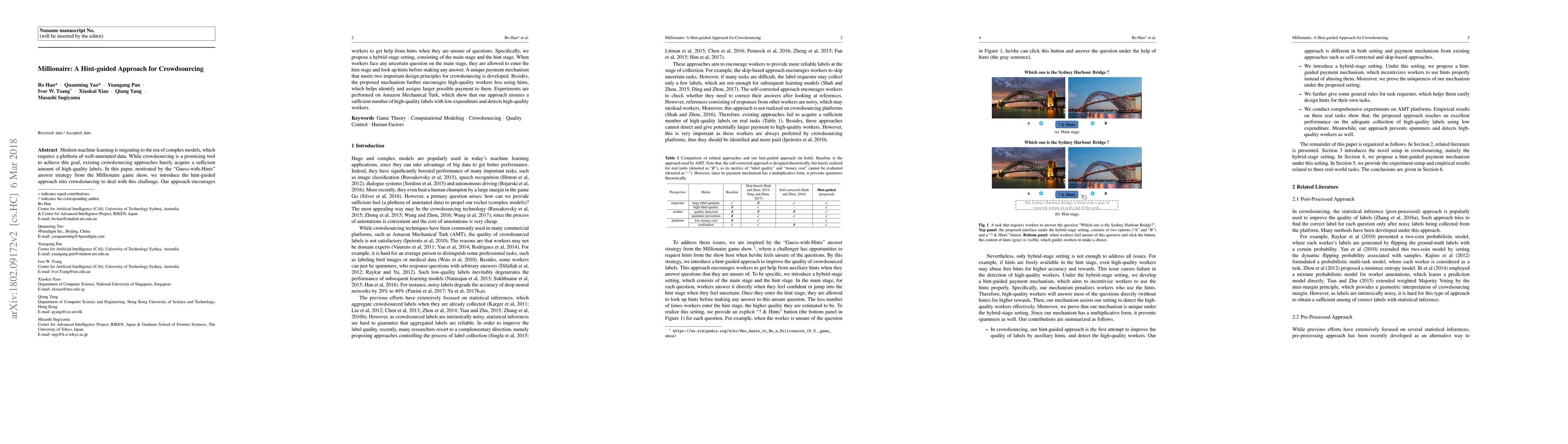 This paper introduces a hint-guided crowdsourcing approach inspired by the "Guess-with-Hints" strategy from the Millionaire game show, aiming to improve the quality of data labels. The proposed hybrid-stage system allows workers to access hints for uncertain questions, ensuring high-quality labels while optimizing payment allocation to high-quality workers.