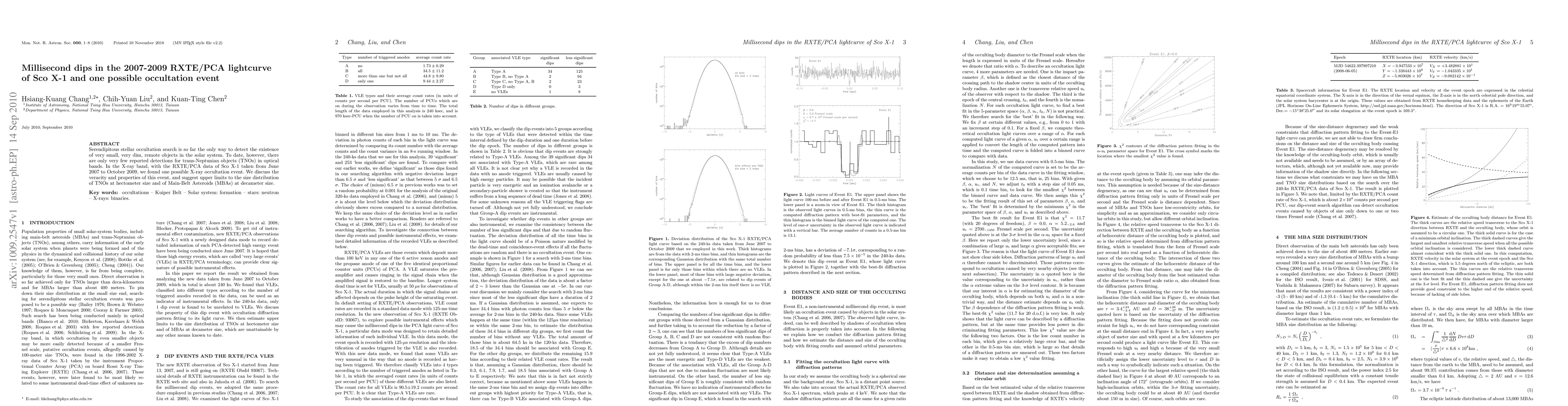 Serendipitous stellar occultation search is so far the only way to detect the existence of very small, very dim, remote objects in the solar system. To date, however, there are only very few reported detections for trans-Neptunian objects (TNOs) in optical bands. In the X-ray band, with the RXTE/PCA data of Sco X-1 taken from June 2007 to October 2009, we found one possible X-ray occultation event. We discuss the veracity and properties of this event, and suggest upper limits to the size distribution of TNOs at hectometer size and of Main-Belt Asteroids (MBAs) at decameter size.