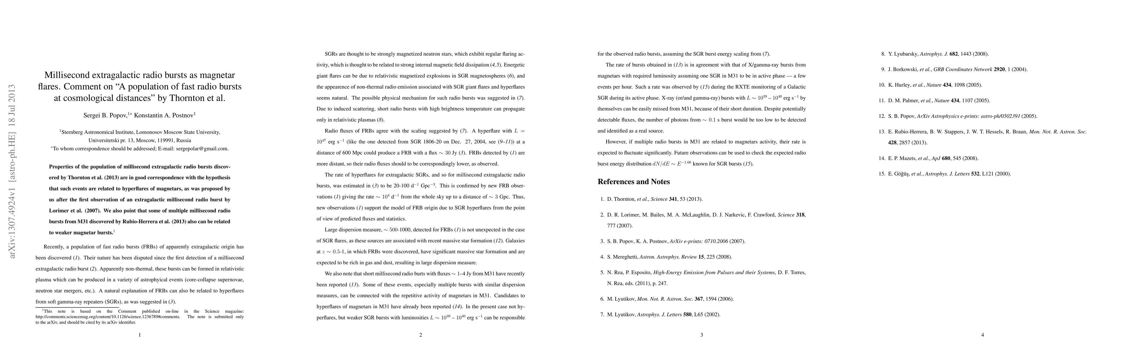 Properties of the population of millisecond extragalactic radio bursts discovered by Thornton et al. (2013) are in good correspondence with the hypothesis that such events are related to hyperflares of magnetars, as was proposed by us after the first observation of an extragalactic millisecond radio burst by Lorimer et al. (2007). We also point that some of multiple millisecond radio bursts from M31 discovered by Rubio-Herrera et al. (2013) also can be related to weaker magnetar bursts.