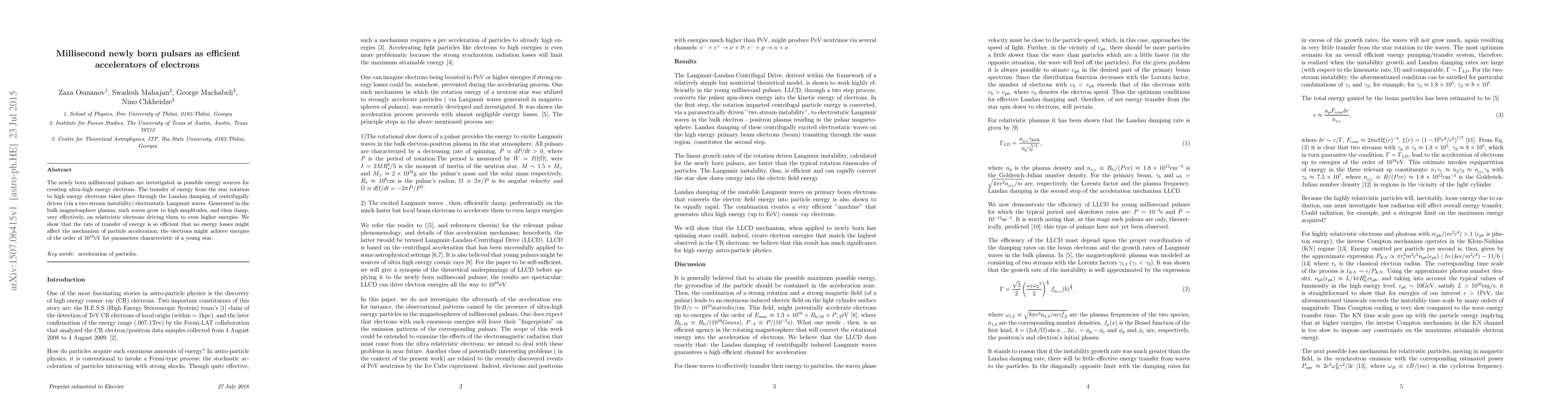 The newly born millisecond pulsars are investigated as possible energy sources for creating ultra-high energy electrons. The transfer of energy from the star rotation to high energy electrons takes place through the Landau damping of centrifugally driven (via a two stream instability) electrostatic Langmuir waves. Generated in the bulk magnetosphere plasma, such waves grow to high amplitudes, and then damp, very effectively, on relativistic electrons driving them to even higher energies. We show that the rate of transfer of energy is so efficient that no energy losses might affect the mechanism of particle acceleration; the electrons might achieve energies of the order of 10^{18}eV for parameters characteristic of a young star.