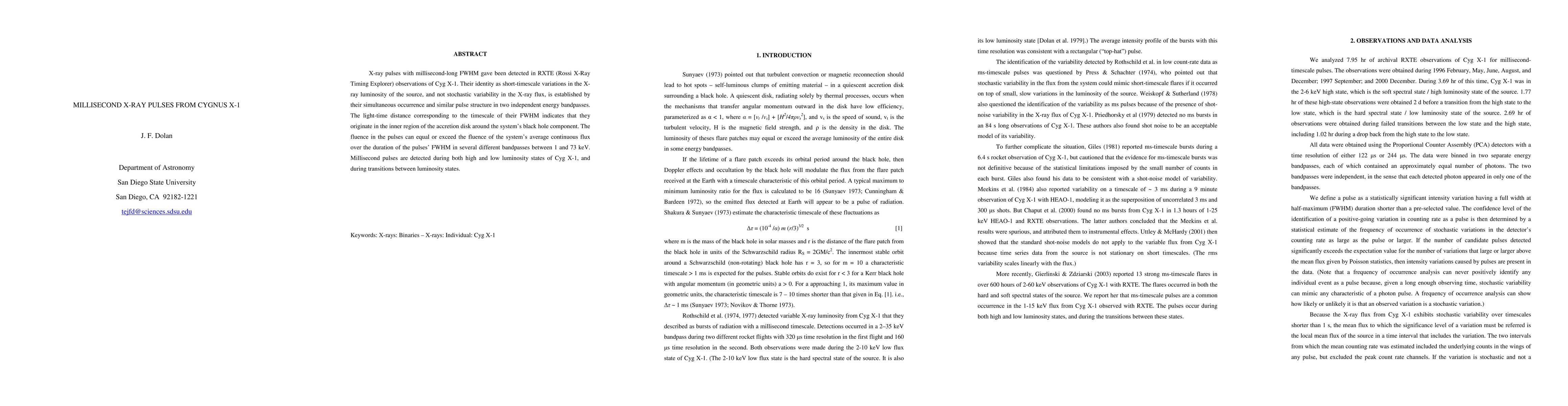 The research analyzed RXTE observations of Cygnus X-1, identifying millisecond X-ray pulses through statistical analysis of counting rates across various energy bandpasses.