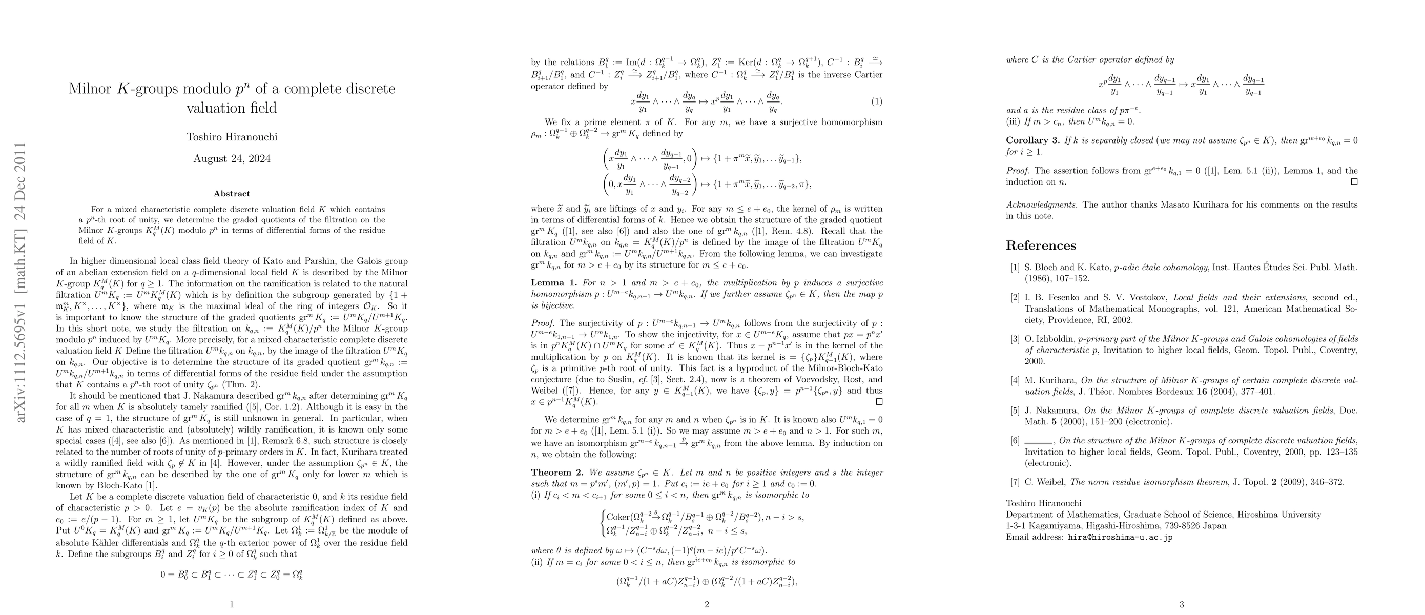 This paper determines the graded quotients of the filtration on Milnor $K$-groups of a mixed characteristic complete discrete valuation field modulo $p^n$, expressing them in terms of differential forms of the residue field. The results are significant for understanding algebraic $K$-theory in characteristic $p$.