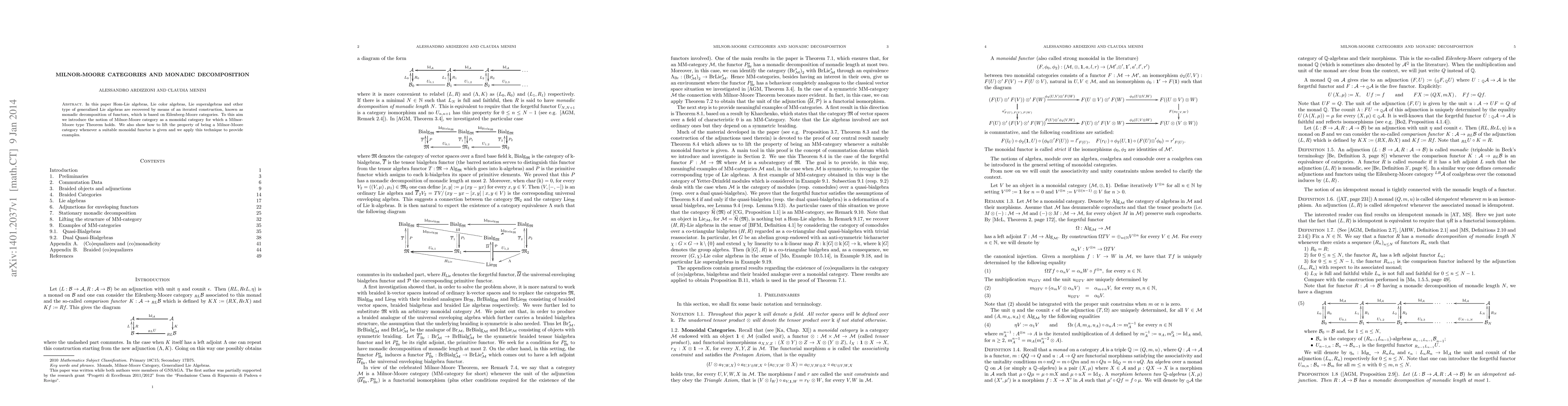 This paper explores the monadic decomposition of functors based on Eilenberg-Moore categories to recover various generalized Lie algebras, introducing the concept of Milnor-Moore categories. It demonstrates the ability to lift the Milnor-Moore property through suitable monoidal functors and provides illustrative examples.