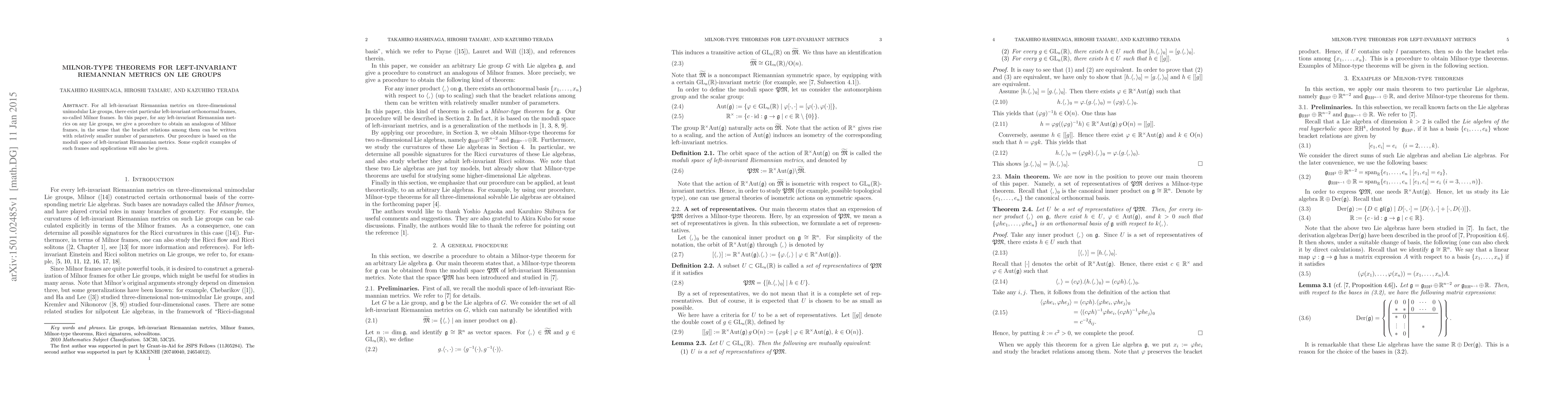 For all left-invariant Riemannian metrics on three-dimensional unimodular Lie groups, there exist particular left-invariant orthonormal frames, so-called Milnor frames. In this paper, for any left-invariant Riemannian metrics on any Lie groups, we give a procedure to obtain an analogous of Milnor frames, in the sense that the bracket relations among them can be written with relatively smaller number of parameters. Our procedure is based on the moduli space of left-invariant Riemannian metrics. Some explicit examples of such frames and applications will also be given.