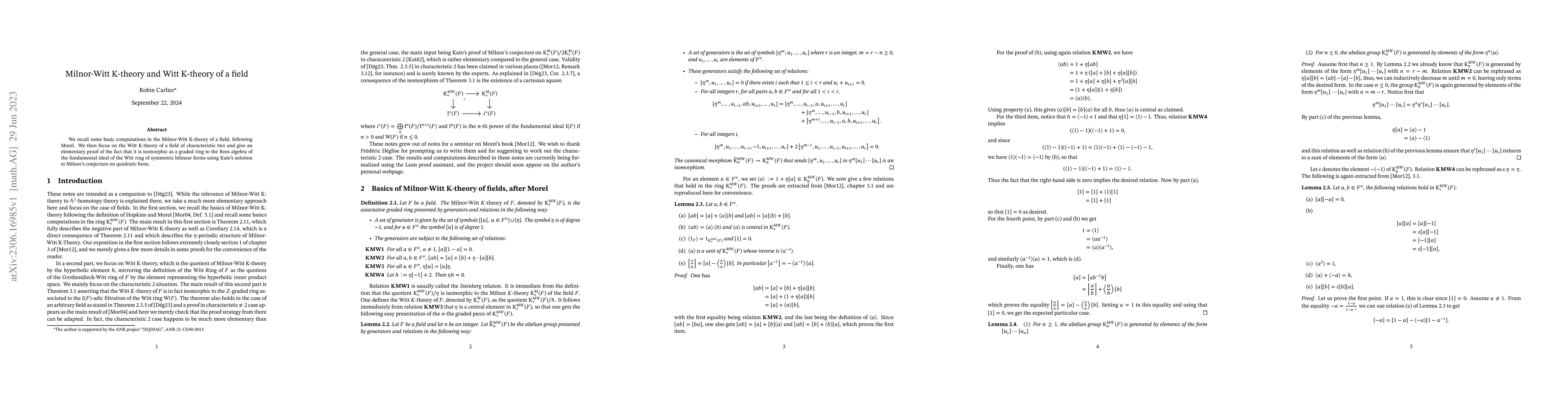 This paper summarizes basic computations in Milnor-Witt K-theory and provides an elementary proof for the isomorphism between Witt K-theory in characteristic two and the Rees algebra of the fundamental ideal of the Witt ring of symmetric bilinear forms, leveraging Kato's resolution of Milnor's conjecture.